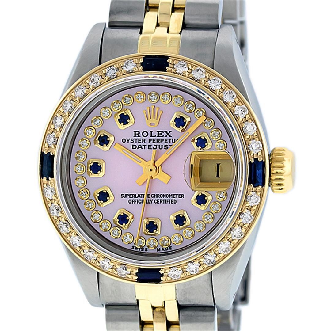 One Ladies 14K Two Tone Rolex Datejust Polished, Serviced & Electronically Tested, 14K Yellow Gold & Stainless Steel Case: 26mm, 14K Yellow Gold Crown, Custom Bezel: New 18K Yellow Gold Sapphire Beadset Diamond Bezel, Diamond Count:�28 Diamonds + 4 Sapphires, Total Weight .70 Carat, Clarity: SI-VS, Color: G to H. Custom Crystal: New Synthetic Sapphire Cyclops Lens. Custom Hands: New Luminescent Hands. Movement: Automatic Winding Movement Caliber 2030. Custom Dial: Pink Mother Of Pearl With Sapphire String Diamond Hour Markers. Stone Count: 10 Sapphires + 33 Diamonds In Dial, Clarity: SI-VS, Color: G to H. Date Window: 3 O'Clock Position Date Display, Model: Datejust. Condition: G-6 Extra Fine. Bracelet: Two Tone 14K Yellow Gold & Stainless Steel Jubilee. Bright Polish.�6.0 Inch Length, Adjustable. Standard Clasp, With Rolex Logo. This Watch Has Been Serviced Time Tested And Is In Excellent Condition It Is Free Of All Scratches And Dents.