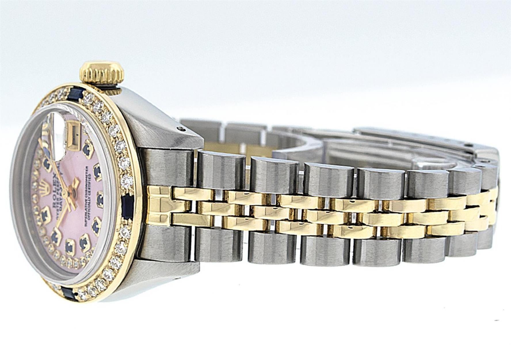 One Ladies 14K Two Tone Rolex Datejust Polished, Serviced & Electronically Tested, 14K Yellow Gold & Stainless Steel Case: 26mm, 14K Yellow Gold Crown, Custom Bezel: New 18K Yellow Gold Sapphire Beadset Diamond Bezel, Diamond Count:�28 Diamonds + 4 Sapphires, Total Weight .70 Carat, Clarity: SI-VS, Color: G to H. Custom Crystal: New Synthetic Sapphire Cyclops Lens. Custom Hands: New Luminescent Hands. Movement: Automatic Winding Movement Caliber 2030. Custom Dial: Pink Mother Of Pearl With Sapphire String Diamond Hour Markers. Stone Count: 10 Sapphires + 33 Diamonds In Dial, Clarity: SI-VS, Color: G to H. Date Window: 3 O'Clock Position Date Display, Model: Datejust. Condition: G-6 Extra Fine. Bracelet: Two Tone 14K Yellow Gold & Stainless Steel Jubilee. Bright Polish.�6.0 Inch Length, Adjustable. Standard Clasp, With Rolex Logo. This Watch Has Been Serviced Time Tested And Is In Excellent Condition It Is Free Of All Scratches And Dents.
