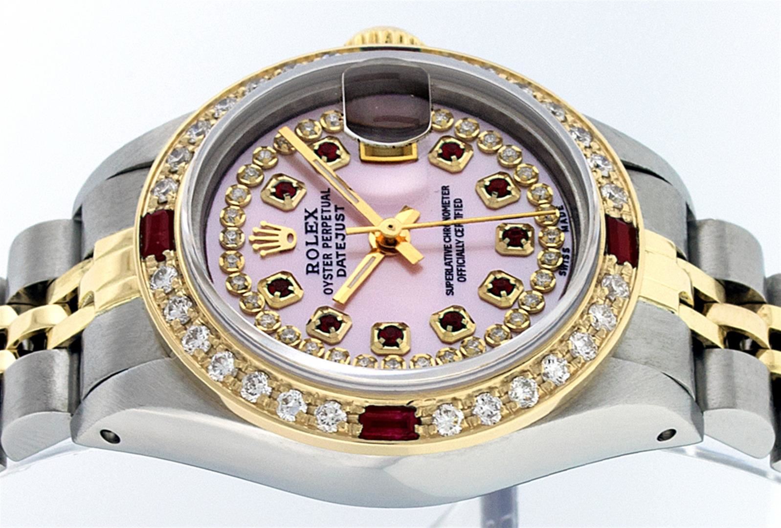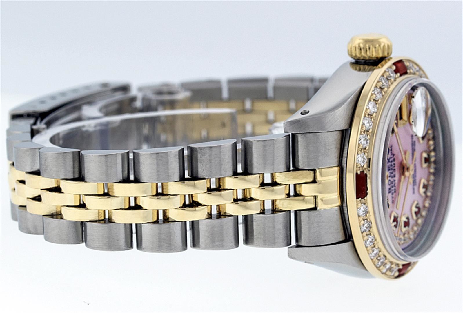 One Ladies 14K Two Tone Rolex Datejust Polished, Serviced & Electronically Tested, 14K Yellow Gold & Stainless Steel Case: 26mm, 14K Yellow Gold Crown, Custom Bezel: New 18K Yellow Gold Ruby Beadset Diamond Bezel, Diamond Count: 28 Diamonds + 4 Rubies, Total Weight .70 Carat, Clarity: SI-VS, Color: G to H. Custom Crystal: New Synthetic Sapphire Cyclops Lens. Custom Hands: New Luminescent Hands. Movement: Automatic Winding Movement Caliber 2030. Custom Dial: Pink Mother Of Pearl With Ruby String Diamond Hour Markers. Stone Count: 10 Rubies + 33 Diamonds In Dial, Clarity: SI-VS, Color: G to H. Date Window: 3 O'Clock Position Date Display, Model: Datejust. Condition: G-6 Extra Fine. Bracelet: Two Tone 14K Yellow Gold & Stainless Steel Jubilee. Bright Polish. 6.0 Inch Length, Adjustable. Standard Clasp, With Rolex Logo. This Watch Has Been Serviced Time Tested And Is In Excellent Condition It Is Free Of All Scratches And Dents.