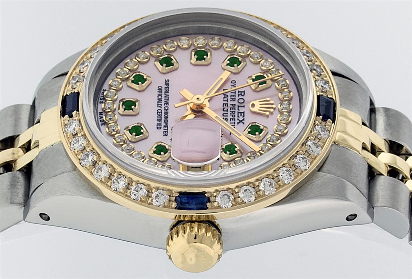 One Ladies 14K Two Tone Rolex Datejust Polished, Serviced & Electronically Tested, 14K Yellow Gold & Stainless Steel Case: 26mm, 14K Yellow Gold Crown, Custom Bezel: New 18K New Yellow Gold Sapphire Beadset Diamond Bezel, Diamond Count: 28 Diamonds + 4 Sapphires In Dial, Total Weight .70 Carat, Clarity: SI-VS, Color: G to H. Custom Crystal: New Scratch Resistant Synthetic Sapphire Cyclops Lens. Custom Hands: New Luminescent Hands. Movement: Automatic Winding Movement Caliber 2030. Custom Dial: Pink Mother Of Pearl Emerald String Diamond, Diamond Count: 10 Emeralds + 33 Diamonds In Dial, Clarity: SI-VS, Color: G to H. Date Window: 3 O'Clock Position Date Display, Model: Datejust. Condition: G-6 Extra Fine. Bracelet: Two Tone 14K Yellow Gold & Stainless Steel Jubilee Band. Bright Polish. 6.0 Inch Length, Adjustable. Standard Clasp, With Rolex Logo. This Watch Has Been Serviced Time Tested And Is In Excellent Condition It Is Free Of All Scratches And Dents.