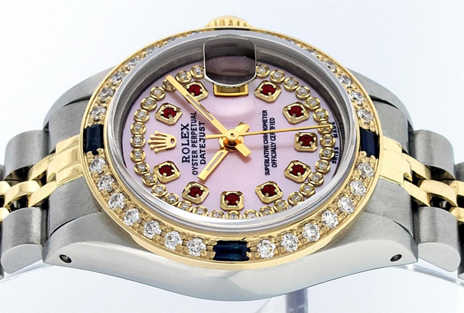 One Ladies 14K Two Tone Rolex Datejust Polished, Serviced & Electronically Tested, 14K Yellow Gold & Stainless Steel Case: 26mm, 14K Yellow Gold Crown, Custom Bezel: New 18K New Yellow Gold Sapphire Beadset Diamond Bezel, Diamond Count: 28 Diamonds + 4 Sapphires In Dial, Total Weight .70 Carat, Clarity: SI-VS, Color: G to H. Custom Crystal: New Scratch Resistant Synthetic Sapphire Cyclops Lens. Custom Hands: New Luminescent Hands. Movement: Automatic Winding Movement Caliber 2030. Custom Dial: Pink Mother Of Pearl Ruby String Diamond Dial, Stone Count: 10 Rubies + 33 Diamonds In Dial, Clarity: SI-VS, Color: G to H. Date Window: 3 O'Clock Position Date Display, Model: Datejust. Condition: G-6 Extra Fine. Bracelet: Two Tone 14K Yellow Gold & Stainless Steel Jubilee Band. Bright Polish. 6.0 Inch Length, Adjustable. Standard Clasp, With Rolex Logo. This Watch Has Been Serviced Time Tested And Is In Excellent Condition It Is Free Of All Scratches And Dents.