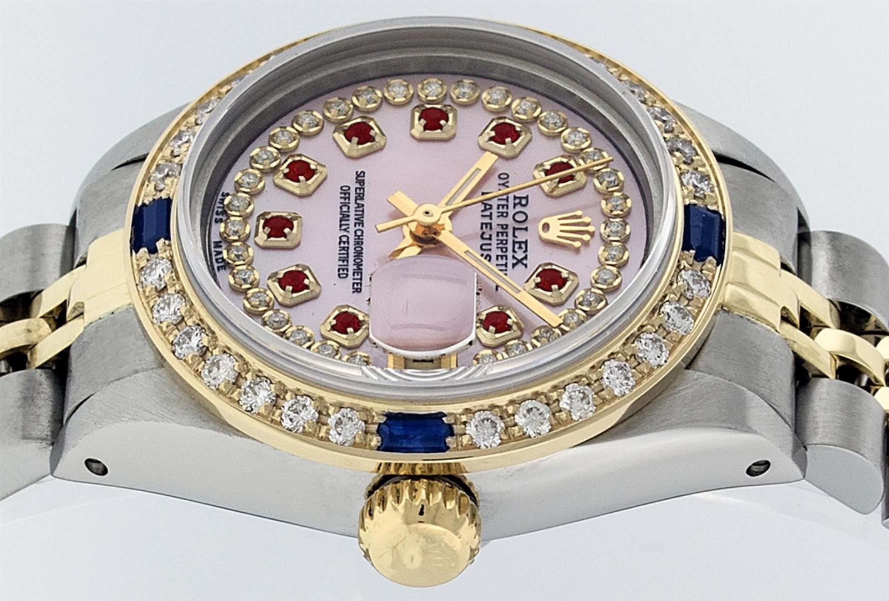 One Ladies 14K Two Tone Rolex Datejust Polished, Serviced & Electronically Tested, 14K Yellow Gold & Stainless Steel Case: 26mm, 14K Yellow Gold Crown, Custom Bezel: New 18K New Yellow Gold Sapphire Beadset Diamond Bezel, Diamond Count: 28 Diamonds + 4 Sapphires In Dial, Total Weight .70 Carat, Clarity: SI-VS, Color: G to H. Custom Crystal: New Scratch Resistant Synthetic Sapphire Cyclops Lens. Custom Hands: New Luminescent Hands. Movement: Automatic Winding Movement Caliber 2030. Custom Dial: Pink Mother Of Pearl Ruby String Diamond Dial, Stone Count: 10 Rubies + 33 Diamonds In Dial, Clarity: SI-VS, Color: G to H. Date Window: 3 O'Clock Position Date Display, Model: Datejust. Condition: G-6 Extra Fine. Bracelet: Two Tone 14K Yellow Gold & Stainless Steel Jubilee Band. Bright Polish. 6.0 Inch Length, Adjustable. Standard Clasp, With Rolex Logo. This Watch Has Been Serviced Time Tested And Is In Excellent Condition It Is Free Of All Scratches And Dents.