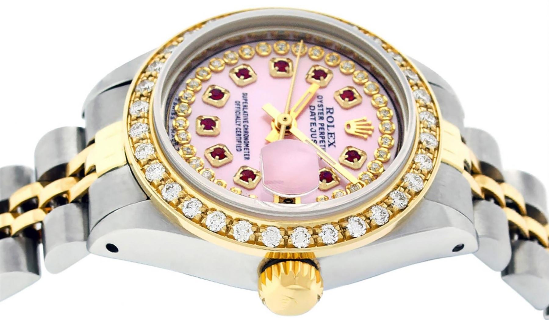 One Ladies 14K Two Tone Rolex Datejust Polished, Serviced & Electronically Tested, 14K Yellow Gold & Stainless Steel Case: 26mm, 14K Yellow Gold Crown, Custom Bezel: New 18K Yellow Gold Beadset Diamond Bezel, Diamond Count: 43 Diamonds in dial, Total Weight .70 Carat, Clarity: SI-VS, Color: G to H. Custom Crystal: New Synthetic Sapphire Cyclops Lens. Custom Hands: New Luminescent Hands. Movement: Automatic Winding Movement Caliber 2030. Custom Dial: Pink Mother Of Pearl String Diamond and Ruby Dial, Stone Count: 33 Diamonds + 10 Ruby, Clarity: SI-VS, Color: G to H. Date Window: 3 O'Clock Position Date Display, Model: Datejust. Condition: G-6 Extra Fine. Bracelet: Two Tone 14K Yellow Gold & Stainless Steel Jubilee Band. Bright Polish. 6.0 Inch Length, Adjustable. Standard Clasp, With Rolex Logo. This Watch Has Been Serviced Time Tested And Is In Excellent Condition It Is Free Of All Scratches And Dents.