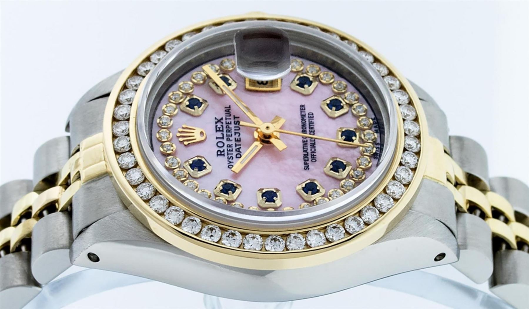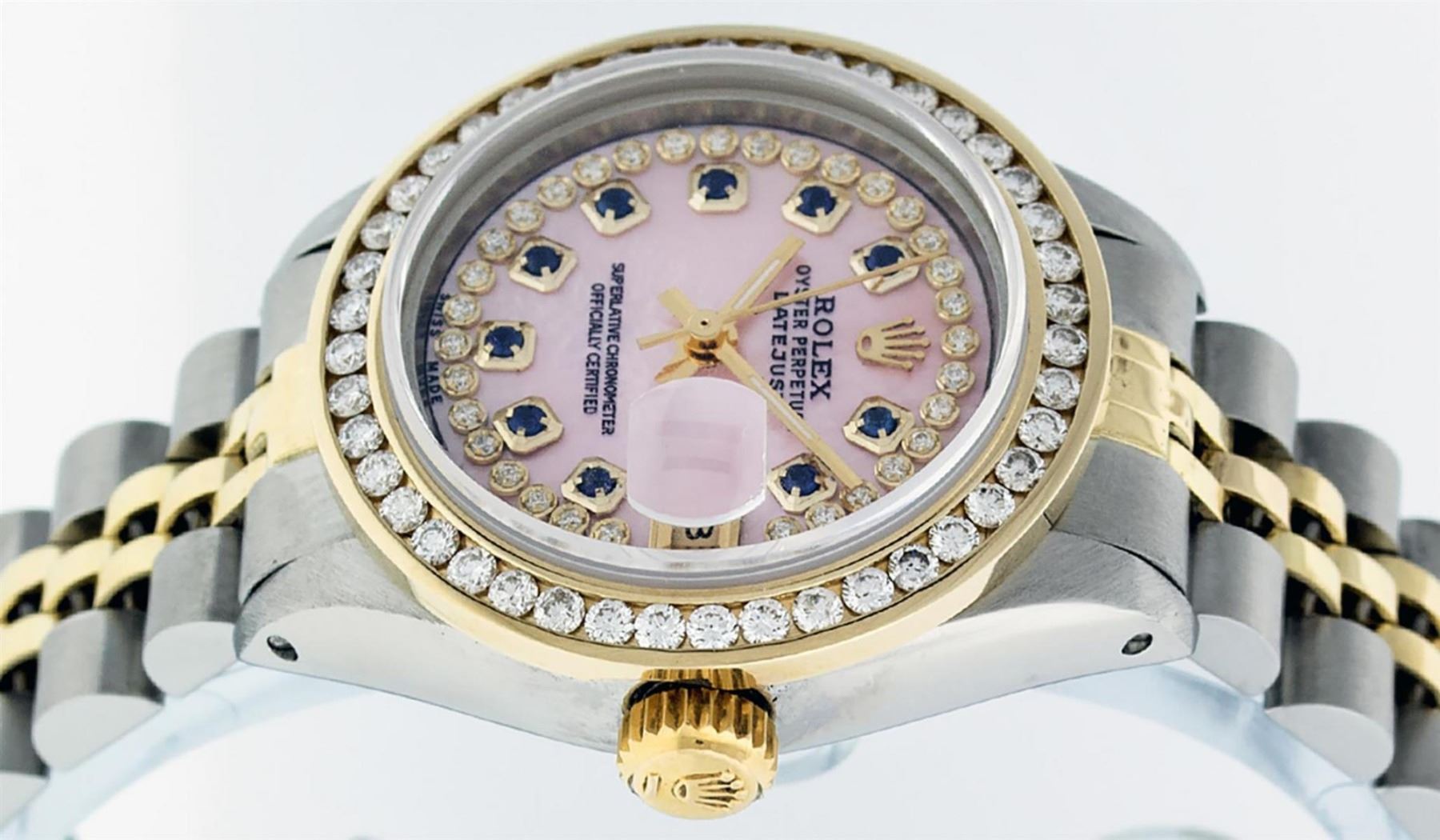 One Ladies 14K Two Tone Rolex Datejust Polished, Serviced & Electronically Tested, 14K Yellow Gold & Stainless Steel Case: 26mm, 14K Yellow Gold Crown, Custom Bezel: New 18K Yellow Gold Channel Set Diamond Bezel, Diamond Count: 43 Diamonds in dial, Total Weight 1.00 Carat, Clarity: SI-VS, Color: G to H. Custom Crystal: New Synthetic Sapphire Cyclops Lens. Custom Hands: New Luminescent Hands. Movement: Automatic Winding Movement Caliber 2030. Custom Dial: Pink Mother Of Pearl String Diamond and Sapphire Dial, Stone Count: 33 Diamonds + 10 Sapphires, Clarity: SI-VS, Color: G to H. Date Window: 3 O'Clock Position Date Display, Model: Datejust. Condition: G-6 Extra Fine. Bracelet: Two Tone 14K Yellow Gold & Stainless Steel Jubilee Band. Bright Polish. 6.0 Inch Length, Adjustable. Standard Clasp, With Rolex Logo. This Watch Has Been Serviced Time Tested And Is In Excellent Condition It Is Free Of All Scratches And Dents.