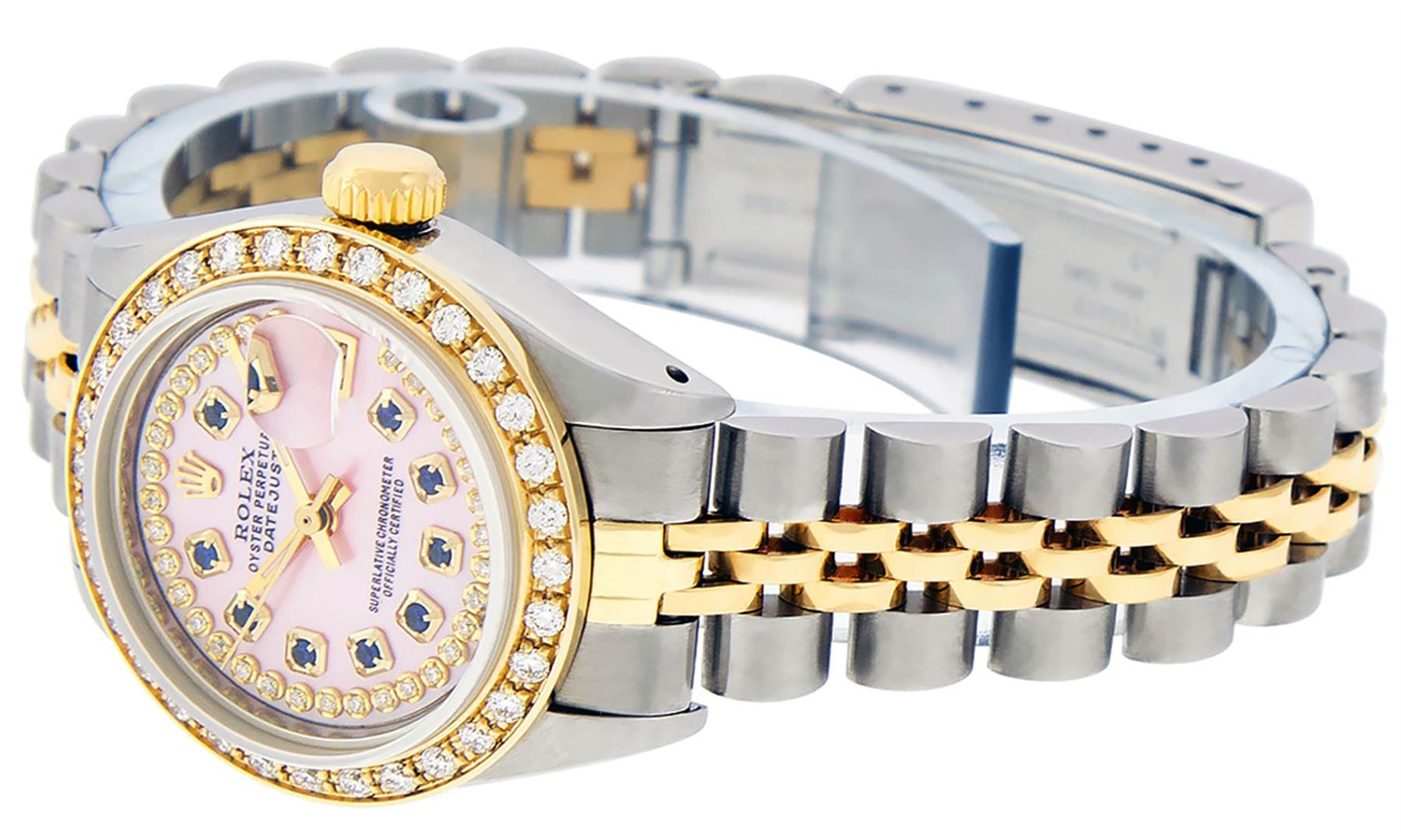 One Ladies 14K Two Tone Rolex Datejust Polished, Serviced & Electronically Tested, 14K Yellow Gold & Stainless Steel Case: 26mm, 14K Yellow Gold Crown, Custom Bezel: New 18K Yellow Gold Beadset Diamond Bezel, Diamond Count: 43 Diamonds in dial, Total Weight .70 Carat, Clarity: SI-VS, Color: G to H. Custom Crystal: New Synthetic Sapphire Cyclops Lens. Custom Hands: New Luminescent Hands. Movement: Automatic Winding Movement Caliber 2030. Custom Dial: Pink Mother Of Pearl String Diamond and Sapphire Dial, Stone Count: 33 Diamonds + 10 Sapphires, Clarity: SI-VS, Color: G to H. Date Window: 3 O'Clock Position Date Display, Model: Datejust. Condition: G-6 Extra Fine. Bracelet: Two Tone 14K Yellow Gold & Stainless Steel Jubilee Band. Bright Polish. 6.0 Inch Length, Adjustable. Standard Clasp, With Rolex Logo. This Watch Has Been Serviced Time Tested And Is In Excellent Condition It Is Free Of All Scratches And Dents.