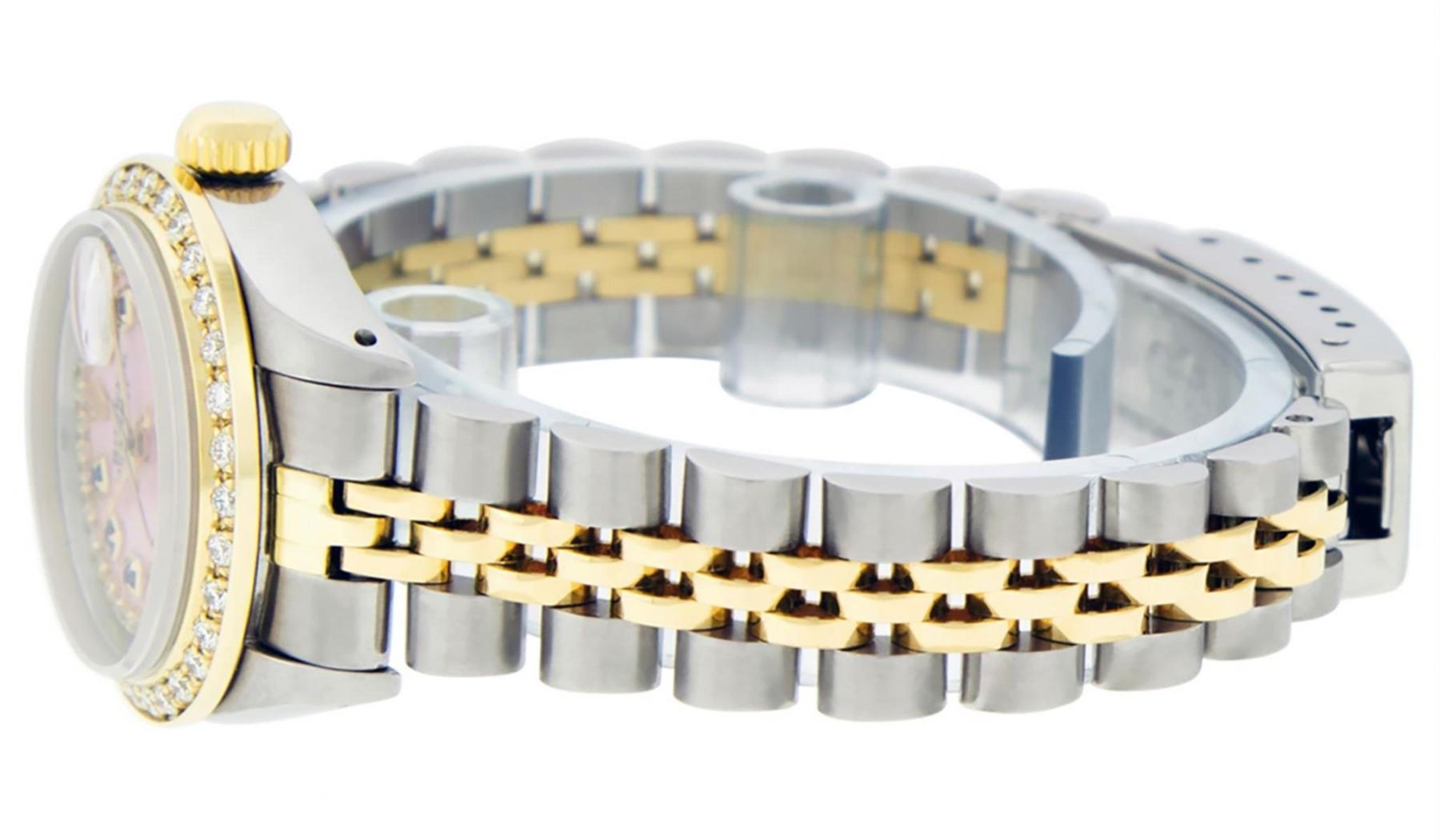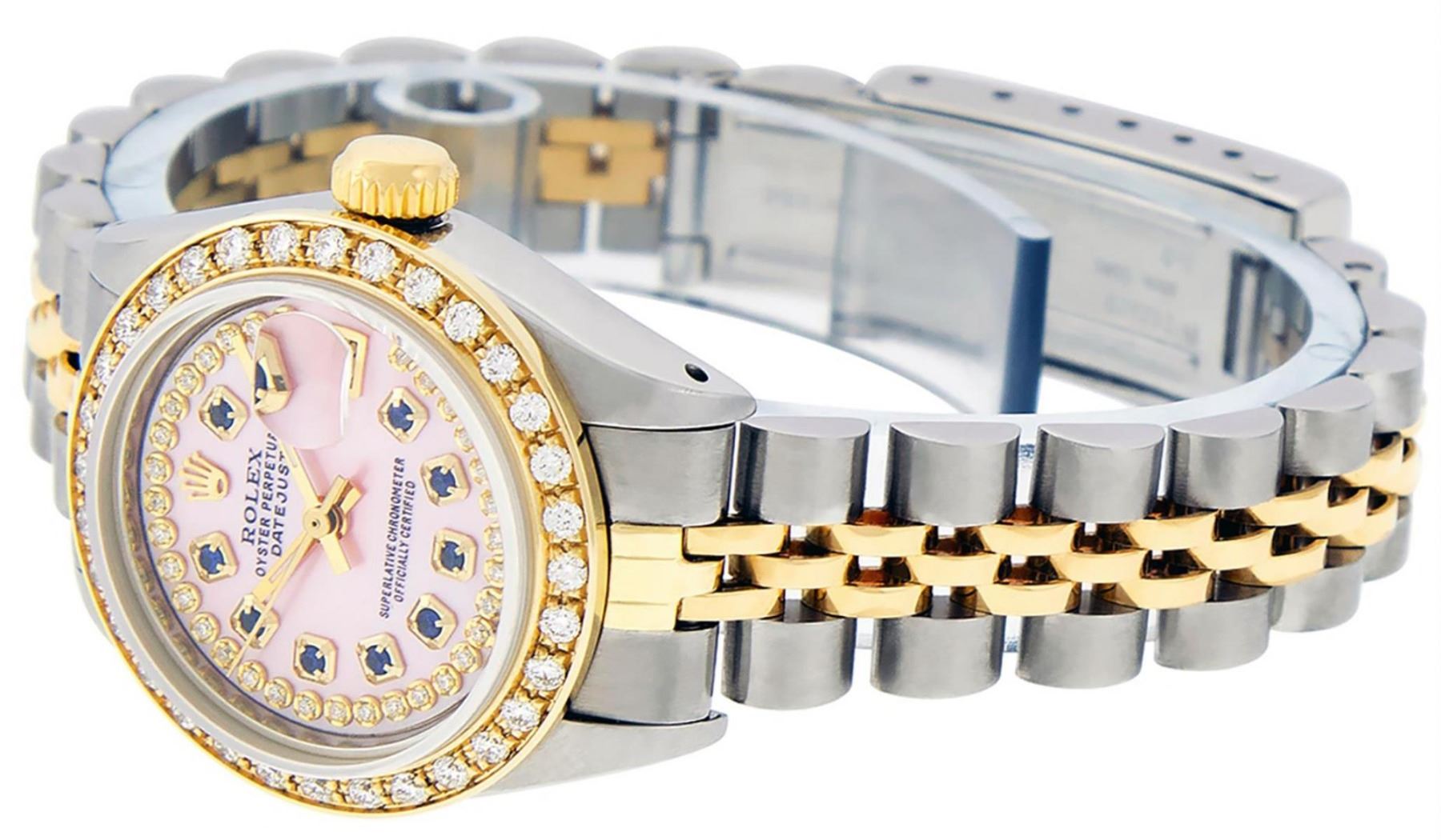 One Ladies 14K Two Tone Rolex Datejust Polished, Serviced & Electronically Tested, 14K Yellow Gold & Stainless Steel Case: 26mm, 14K Yellow Gold Crown, Custom Bezel: New 18K Yellow Gold Beadset Diamond Bezel, Diamond Count: 43 Diamonds in dial, Total Weight .70 Carat, Clarity: SI-VS, Color: G to H. Custom Crystal: New Synthetic Sapphire Cyclops Lens. Custom Hands: New Luminescent Hands. Movement: Automatic Winding Movement Caliber 2030. Custom Dial: Pink Mother Of Pearl String Diamond and Sapphire Dial, Stone Count: 33 Diamonds + 10 Sapphires, Clarity: SI-VS, Color: G to H. Date Window: 3 O'Clock Position Date Display, Model: Datejust. Condition: G-6 Extra Fine. Bracelet: Two Tone 14K Yellow Gold & Stainless Steel Jubilee Band. Bright Polish. 6.0 Inch Length, Adjustable. Standard Clasp, With Rolex Logo. This Watch Has Been Serviced Time Tested And Is In Excellent Condition It Is Free Of All Scratches And Dents.