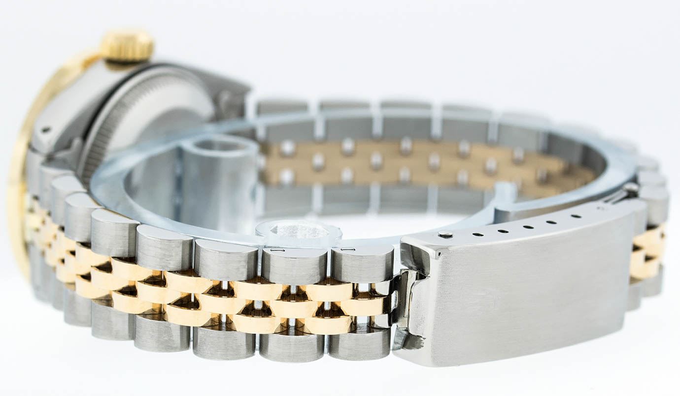 One Ladies 14 Two Tone Rolex Datejust Polished, Serviced & Electronically Tested, 14K Yellow Gold & Stainless Steel Case: 26mm, 14K Yellow Gold Crown, Custom Bezel: 18K Yellow Gold Pyramid Diamond Bezel, Diamond Count: 24 Diamonds Total Weight .50 Carat, Clarity: Si-VS, Color: G to H. Custom Crystal: Synthetic Sapphire Cyclops Lens. Custom Hands: New Luminescent Hands. Movement: Automatic Winding Movement Caliber 2030. Custom Dial: Pink Mother Of Pearl Baguette Diamond Hour Markers. 10 Baguette Diamonds In Dial, Clarity: SI-VS, Color: G to H. Date Window: 3 O'Clock Position Date Display, Model: Datejust. Condition: G-6 Extra Fine. Bracelet: Two Tone 14K Yellow Gold & Stainless Steel Jubilee. Bright Polish. 6.0 Inch Length, Adjustable. Standard Clasp, With Rolex Logo. This Watch Has Been Serviced Time Tested And Is In Excellent Condition It Is Free Of All Scratches And Dents.