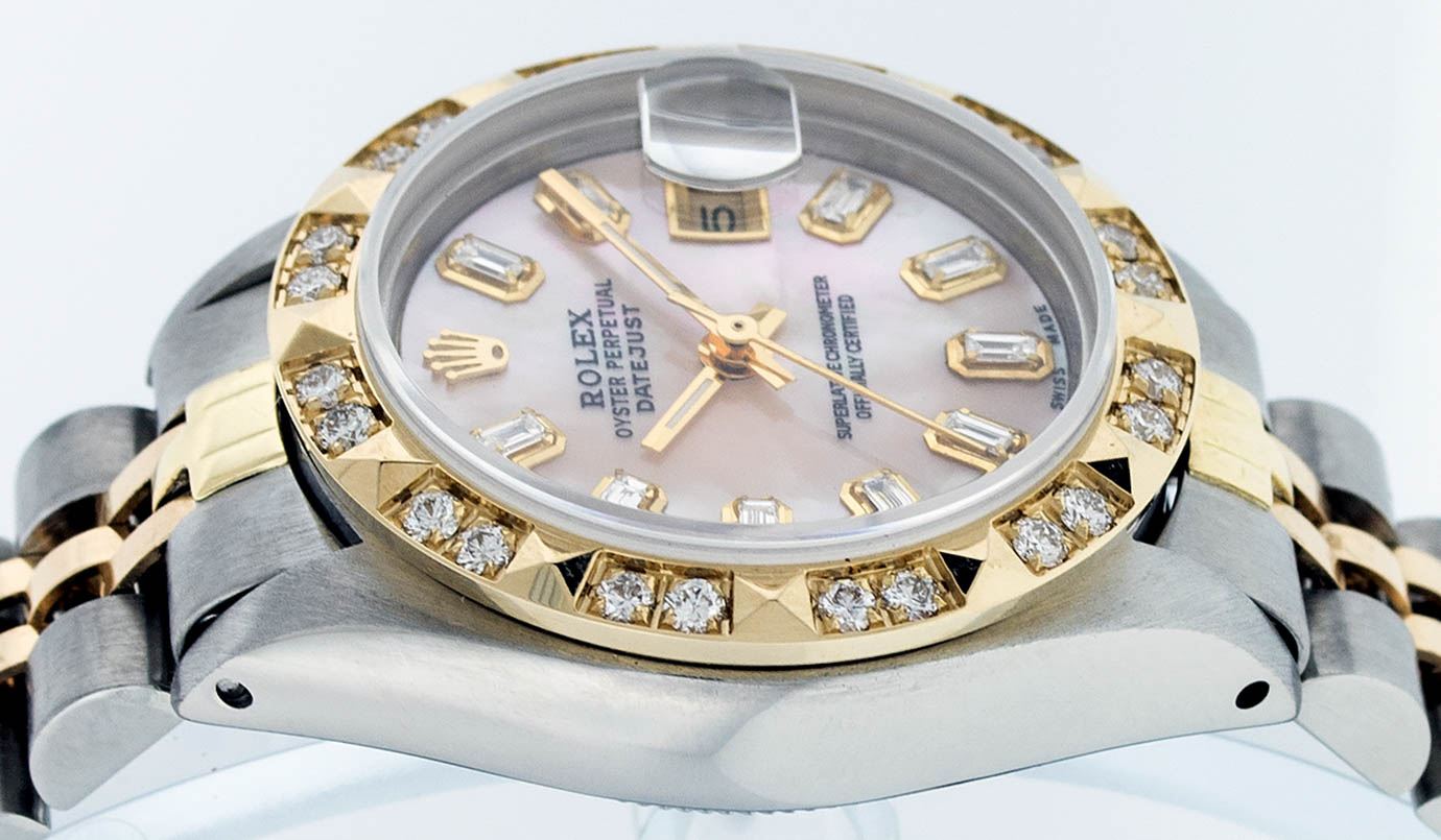 One Ladies 14 Two Tone Rolex Datejust Polished, Serviced & Electronically Tested, 14K Yellow Gold & Stainless Steel Case: 26mm, 14K Yellow Gold Crown, Custom Bezel: 18K Yellow Gold Pyramid Diamond Bezel, Diamond Count: 24 Diamonds Total Weight .50 Carat, Clarity: Si-VS, Color: G to H. Custom Crystal: Synthetic Sapphire Cyclops Lens. Custom Hands: New Luminescent Hands. Movement: Automatic Winding Movement Caliber 2030. Custom Dial: Pink Mother Of Pearl Baguette Diamond Hour Markers. 10 Baguette Diamonds In Dial, Clarity: SI-VS, Color: G to H. Date Window: 3 O'Clock Position Date Display, Model: Datejust. Condition: G-6 Extra Fine. Bracelet: Two Tone 14K Yellow Gold & Stainless Steel Jubilee. Bright Polish. 6.0 Inch Length, Adjustable. Standard Clasp, With Rolex Logo. This Watch Has Been Serviced Time Tested And Is In Excellent Condition It Is Free Of All Scratches And Dents.