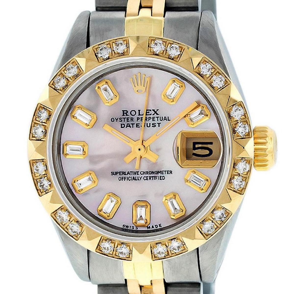 One Ladies 14 Two Tone Rolex Datejust Polished, Serviced & Electronically Tested, 14K Yellow Gold & Stainless Steel Case: 26mm, 14K Yellow Gold Crown, Custom Bezel: 18K Yellow Gold Pyramid Diamond Bezel, Diamond Count: 24 Diamonds Total Weight .50 Carat, Clarity: Si-VS, Color: G to H. Custom Crystal: Synthetic Sapphire Cyclops Lens. Custom Hands: New Luminescent Hands. Movement: Automatic Winding Movement Caliber 2030. Custom Dial: Pink Mother Of Pearl Baguette Diamond Hour Markers. 10 Baguette Diamonds In Dial, Clarity: SI-VS, Color: G to H. Date Window: 3 O'Clock Position Date Display, Model: Datejust. Condition: G-6 Extra Fine. Bracelet: Two Tone 14K Yellow Gold & Stainless Steel Jubilee. Bright Polish. 6.0 Inch Length, Adjustable. Standard Clasp, With Rolex Logo. This Watch Has Been Serviced Time Tested And Is In Excellent Condition It Is Free Of All Scratches And Dents.
