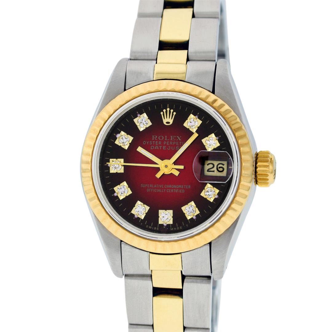 One Ladies 14K Two Tone Rolex Datejust Polished, Serviced & Electronically Tested, 14K Yellow Gold & Stainless Steel Case: 26mm, 14K Yellow Gold Crown, Bezel: 14K Yellow Gold Fluted Bezel. Custom Crystal: New Acrylic Cyclops Lens. Custom Hands: New Luminescent Hands. Movement: Automatic Winding Movement Caliber 2030. Custom Dial: Red Vignette With Diamond Hour Markers Dash Track & Lumi Dots, Diamond Count: 10 Single Cut Diamonds, Color: G to H, Clarity: VS. Date Window: 3 O'Clock Position Date Display, Model: Datejust. Condition: G-6 Extra Fine. Bracelet: Two Tone 14K Yellow Gold & Stainless Steel Oyster Band. Bright Polish. 6.0 Inch Length, Adjustable. Standard Clasp, With Rolex Logo. This Watch Has Been Serviced Time Tested And Is In Excellent Condition It Is Free Of All Scratches And Dents.