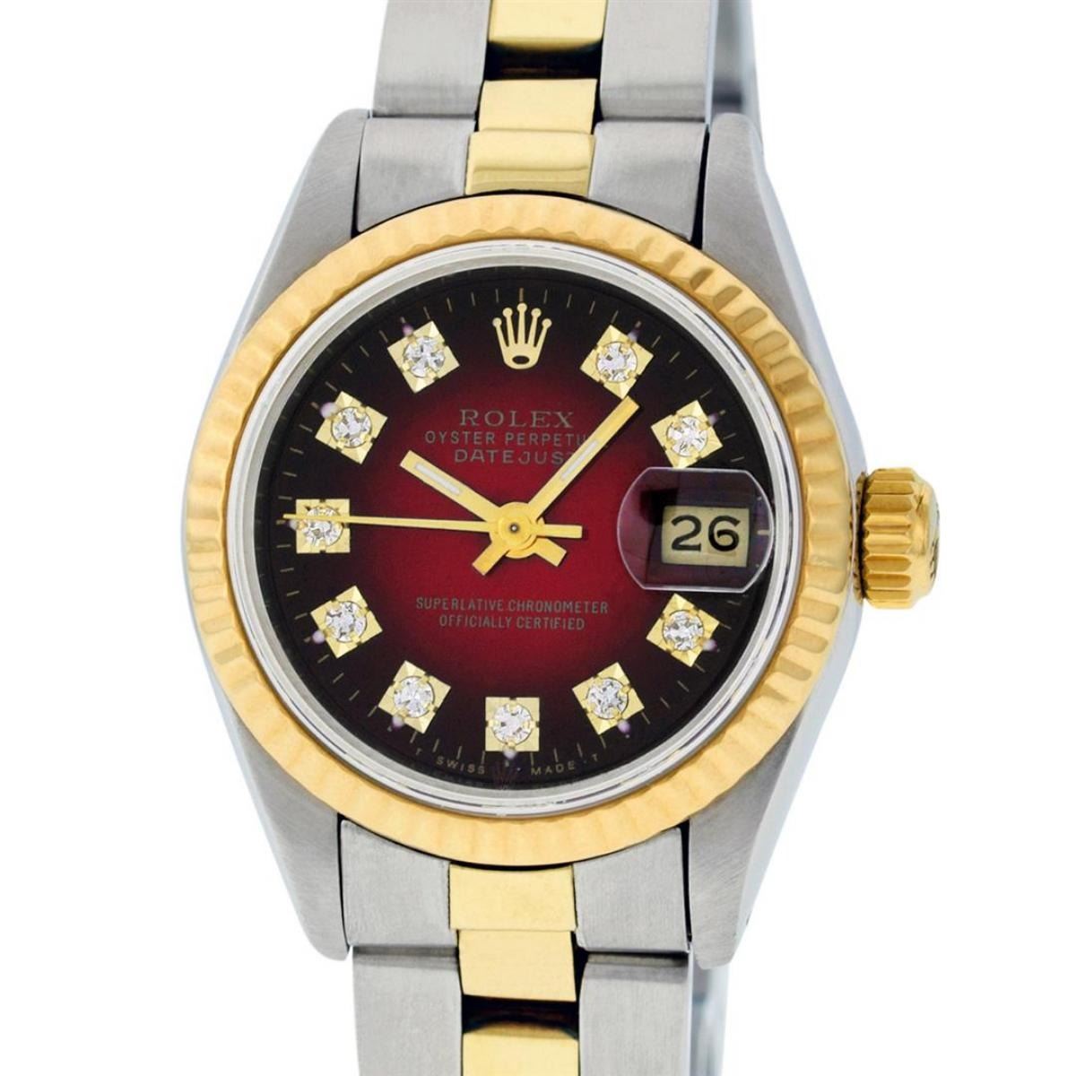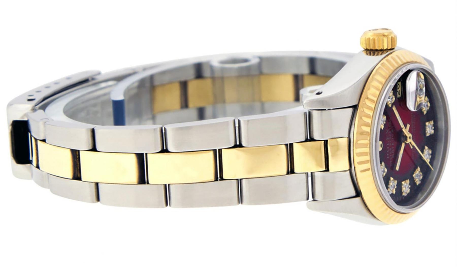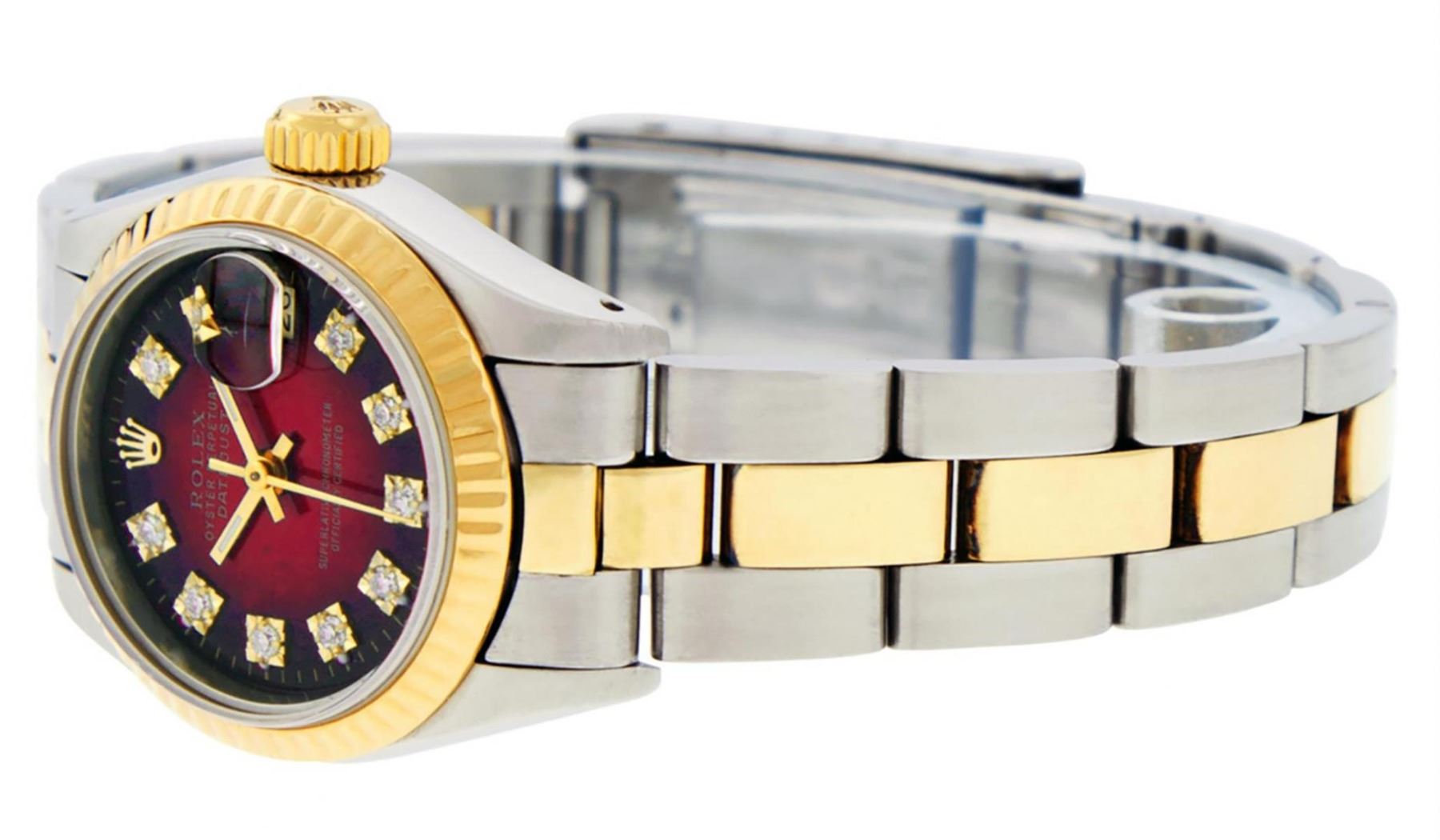 One Ladies 14K Two Tone Rolex Datejust Polished, Serviced & Electronically Tested, 14K Yellow Gold & Stainless Steel Case: 26mm, 14K Yellow Gold Crown, Bezel: 14K Yellow Gold Fluted Bezel. Custom Crystal: New Acrylic Cyclops Lens. Custom Hands: New Luminescent Hands. Movement: Automatic Winding Movement Caliber 2030. Custom Dial: Red Vignette With Diamond Hour Markers Dash Track & Lumi Dots, Diamond Count: 10 Single Cut Diamonds, Color: G to H, Clarity: VS. Date Window: 3 O'Clock Position Date Display, Model: Datejust. Condition: G-6 Extra Fine. Bracelet: Two Tone 14K Yellow Gold & Stainless Steel Oyster Band. Bright Polish. 6.0 Inch Length, Adjustable. Standard Clasp, With Rolex Logo. This Watch Has Been Serviced Time Tested And Is In Excellent Condition It Is Free Of All Scratches And Dents.