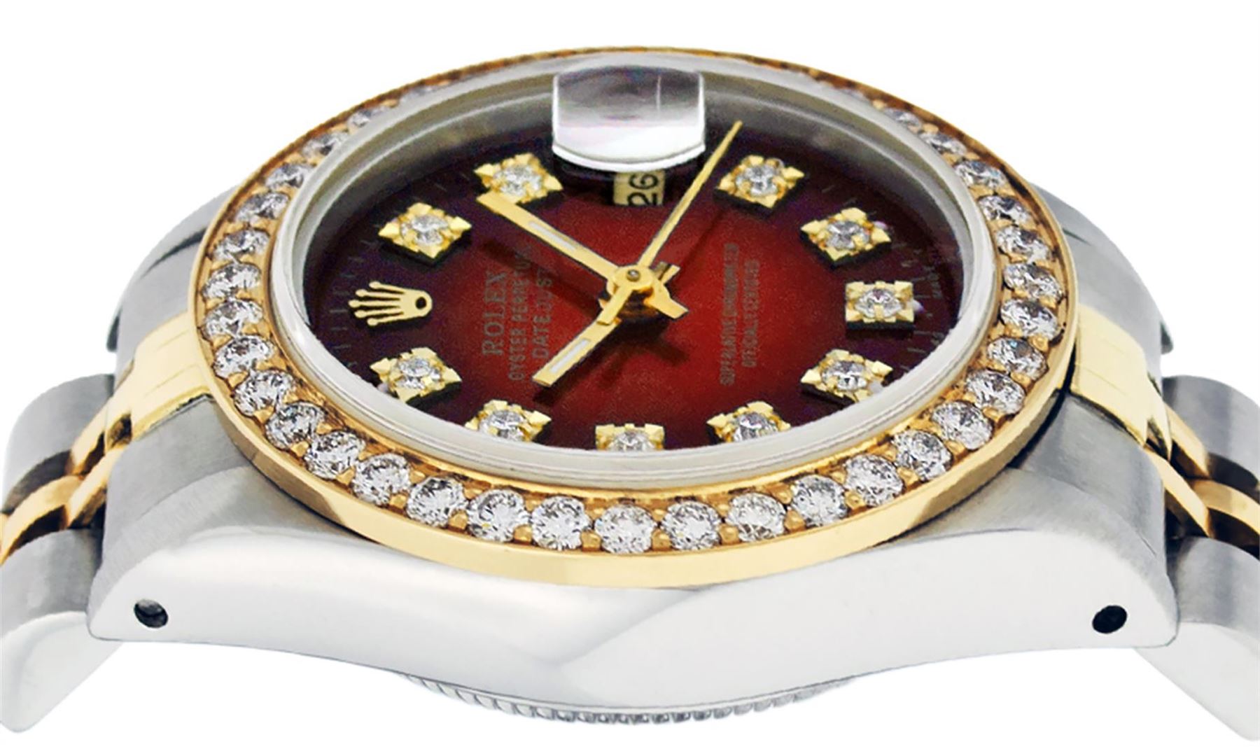 One Ladies 14K Two Tone Rolex Datejust Polished, Serviced & Electronically Tested, 14K Yellow Gold & Stainless Steel Case: 26mm, 14K Yellow Gold Crown, Custom Bezel: New 18K 1ctw Yellow Gold Beadset Diamond Bezel, Diamond Count: 42 Diamonds, Total Weight 1.00 Carat, Clarity: SI-VS, Color: G to H. Custom Crystal: New Synthetic Sapphire Cyclops Lens. Custom Hands: New Luminescent Hands. Movement: Automatic Winding Movement Caliber 2030. Custom Dial: Red Vignette VS Diamond Dial, Diamond Count: 10 Single Cut Diamonds in Dial, G To H In Color, VS Clarity. Date Window: 3 O'Clock Position Date Display, Model: Datejust, Condition: G-6 Extra Fine. Bracelet: Two Tone 14K Yellow Gold & Stainless Steel Jubilee Band. Bright Polish. 6.0 Inch Length, Adjustable. Standard Clasp, With Rolex Logo. This Watch Has Been Serviced Time Tested And Is In Excellent Condition It Is Free Of All Scratches And Dents.