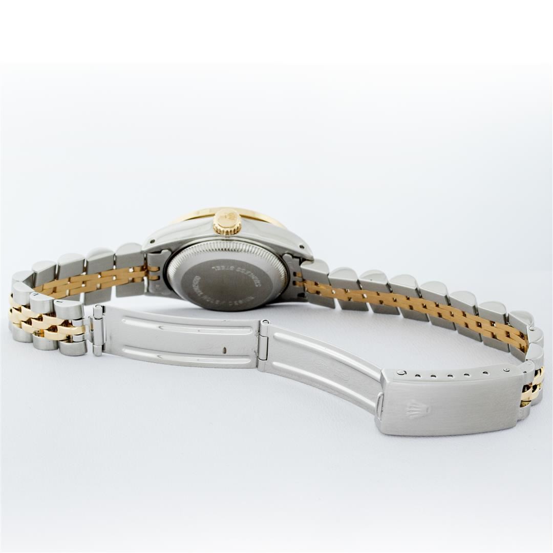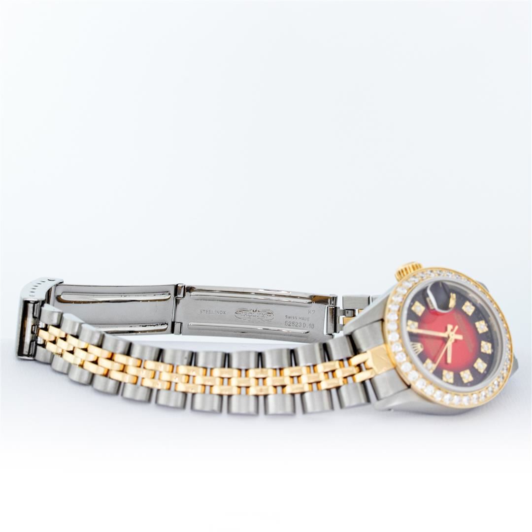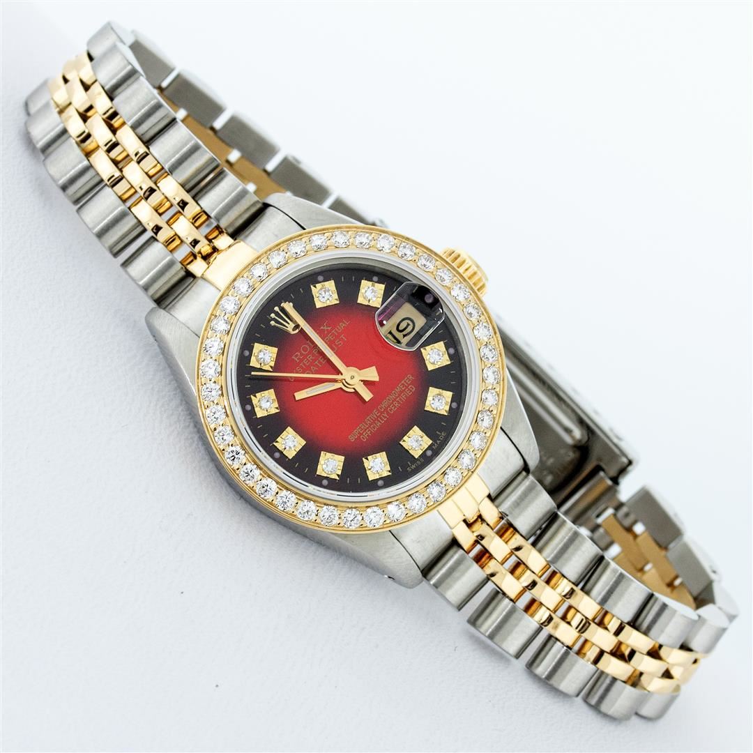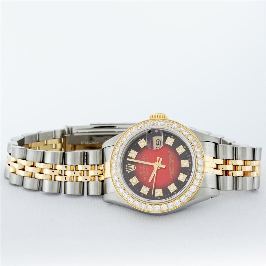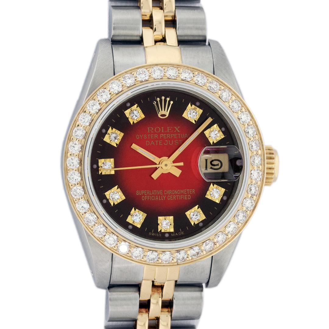 One Ladies 14K Two Tone Rolex Datejust Polished, Serviced & Electronically Tested, 14K Yellow Gold & Stainless Steel Case: 26mm, 14K Yellow Gold Crown, Custom Bezel: New 18K 1ctw Yellow Gold Beadset Diamond Bezel, Diamond Count: 42 Diamonds, Total Weight 1.00 Carat, Clarity: SI-VS, Color: G to H. Custom Crystal: New Synthetic Sapphire Cyclops Lens. Custom Hands: New Luminescent Hands. Movement: Automatic Winding Movement Caliber 2030. Custom Dial: Red Vignette VS Diamond Dial, Diamond Count: 10 Single Cut Diamonds in Dial, G To H In Color, VS Clarity. Date Window: 3 O'Clock Position Date Display, Model: Datejust, Condition: G-6 Extra Fine. Bracelet: Two Tone 14K Yellow Gold & Stainless Steel Jubilee Band. Bright Polish. 6.0 Inch Length, Adjustable. Standard Clasp, With Rolex Logo. This Watch Has Been Serviced Time Tested And Is In Excellent Condition It Is Free Of All Scratches And Dents.