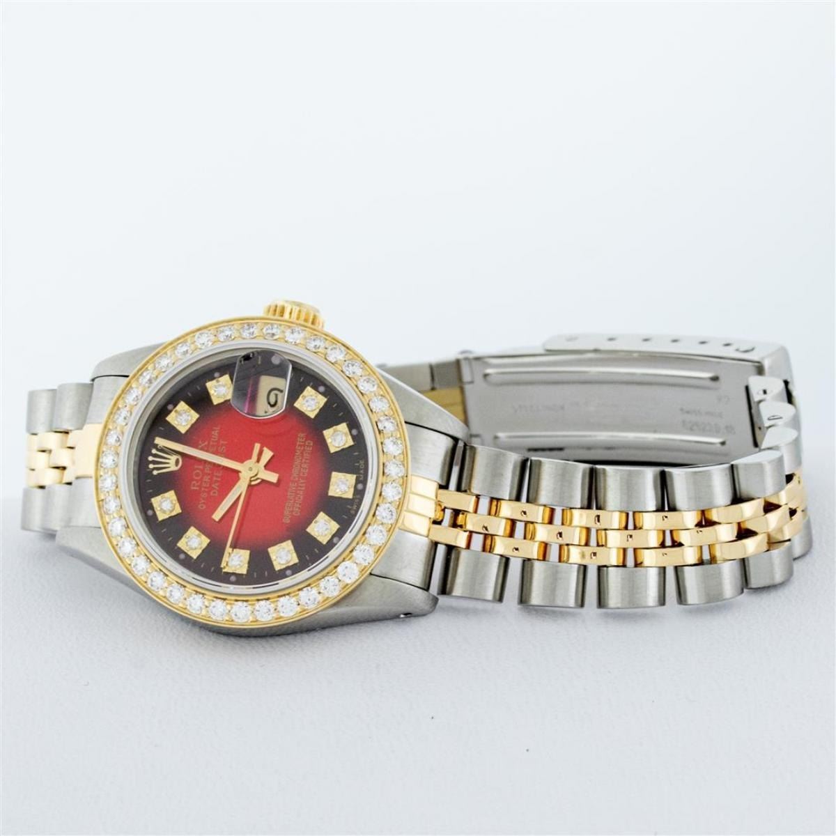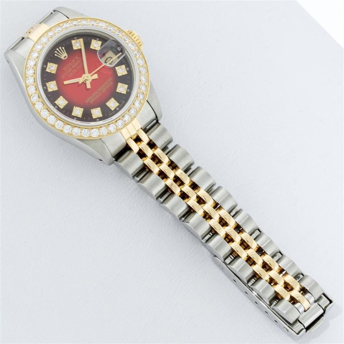 One Ladies 14K Two Tone Rolex Datejust Polished, Serviced & Electronically Tested, 14K Yellow Gold & Stainless Steel Case: 26mm, 14K Yellow Gold Crown, Custom Bezel: New 18K 1ctw Yellow Gold Beadset Diamond Bezel, Diamond Count: 42 Diamonds, Total Weight 1.00 Carat, Clarity: SI-VS, Color: G to H. Custom Crystal: New Synthetic Sapphire Cyclops Lens. Custom Hands: New Luminescent Hands. Movement: Automatic Winding Movement Caliber 2030. Custom Dial: Red Vignette VS Diamond Dial, Diamond Count: 10 Single Cut Diamonds in Dial, G To H In Color, VS Clarity. Date Window: 3 O'Clock Position Date Display, Model: Datejust, Condition: G-6 Extra Fine. Bracelet: Two Tone 14K Yellow Gold & Stainless Steel Jubilee Band. Bright Polish. 6.0 Inch Length, Adjustable. Standard Clasp, With Rolex Logo. This Watch Has Been Serviced Time Tested And Is In Excellent Condition It Is Free Of All Scratches And Dents.