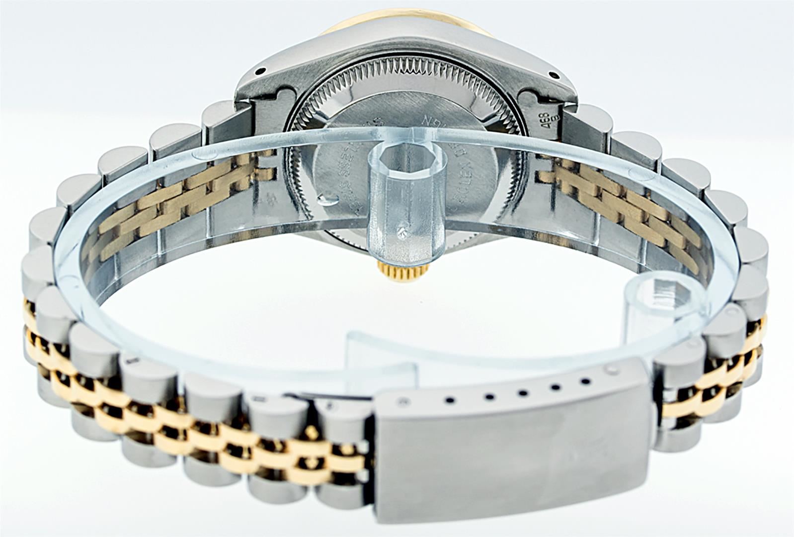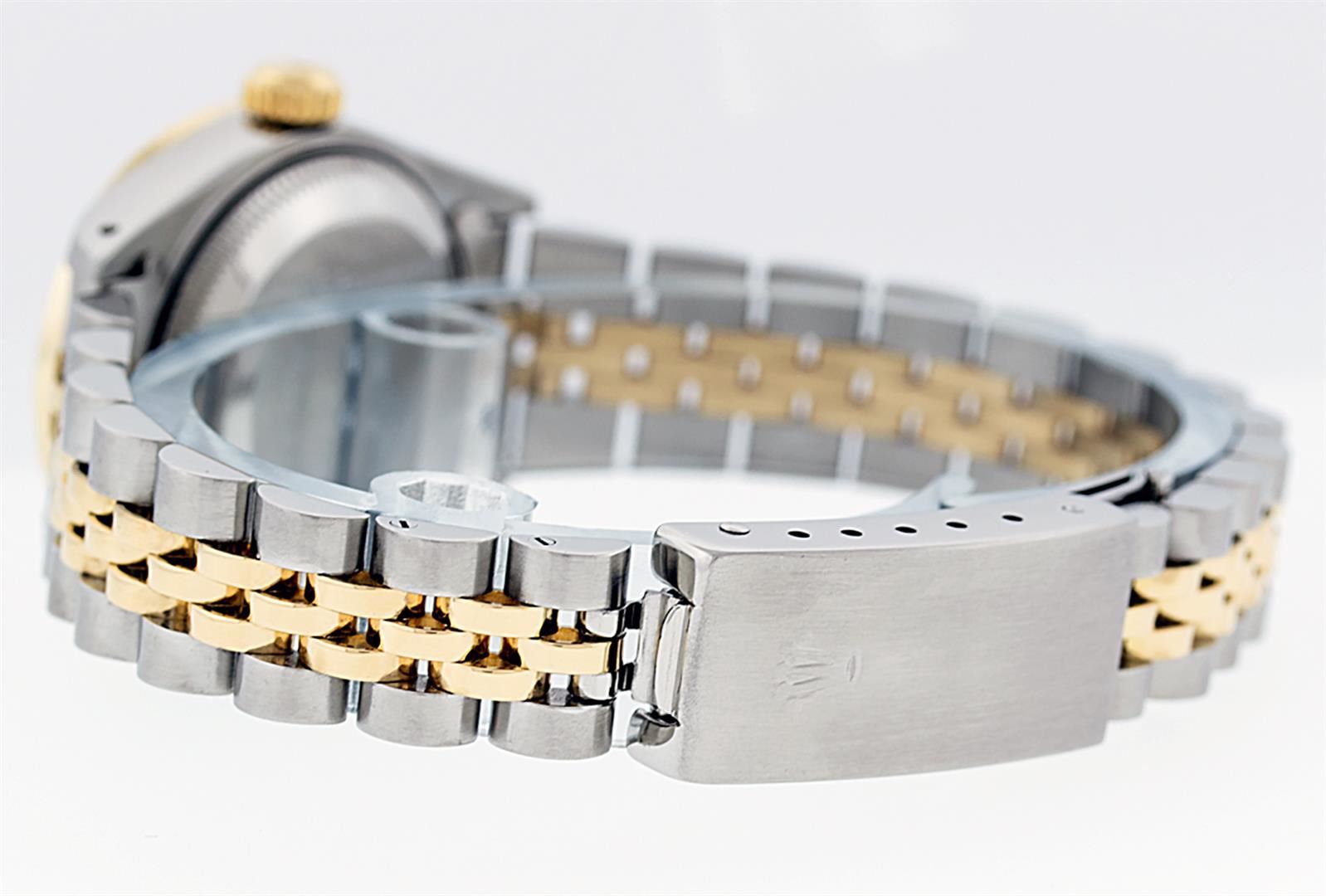 One Ladies 14K Two Tone Rolex Datejust Polished, Serviced & Electronically Tested, 14K Yellow Gold & Stainless Steel Case: 26mm, 14K Yellow Gold Crown, Custom Bezel: New 18K Yellow Gold� Beadset Diamond Bezel, Diamond Count: 32 Diamonds On Bezel, Total Weight .70 Carat, Clarity: SI-VS, Color: G to H. Custom Crystal: New Scratch Resistant Synthetic Sapphire Cyclops Lens. Custom Hands: New Luminescent Hands. Movement: Automatic Winding Movement Caliber 2030. Custom Dial: Salmon With Single Cut Diamond Hour Markers, 10 Diamonds In Dial G To H In Color, VS Clarity. Date Window: 3 O'Clock Position Date Display, Model: Datejust. Condition: G-6 Extra Fine. Bracelet: Two Tone 14K Yellow Gold & Stainless Steel Jubilee Band. Bright Polish. 6.0 Inch Length, Adjustable. Standard Clasp, With Rolex Logo. This Watch Has Been Serviced Time Tested And Is In Excellent Condition It Is Free Of All Scratches And Dents.