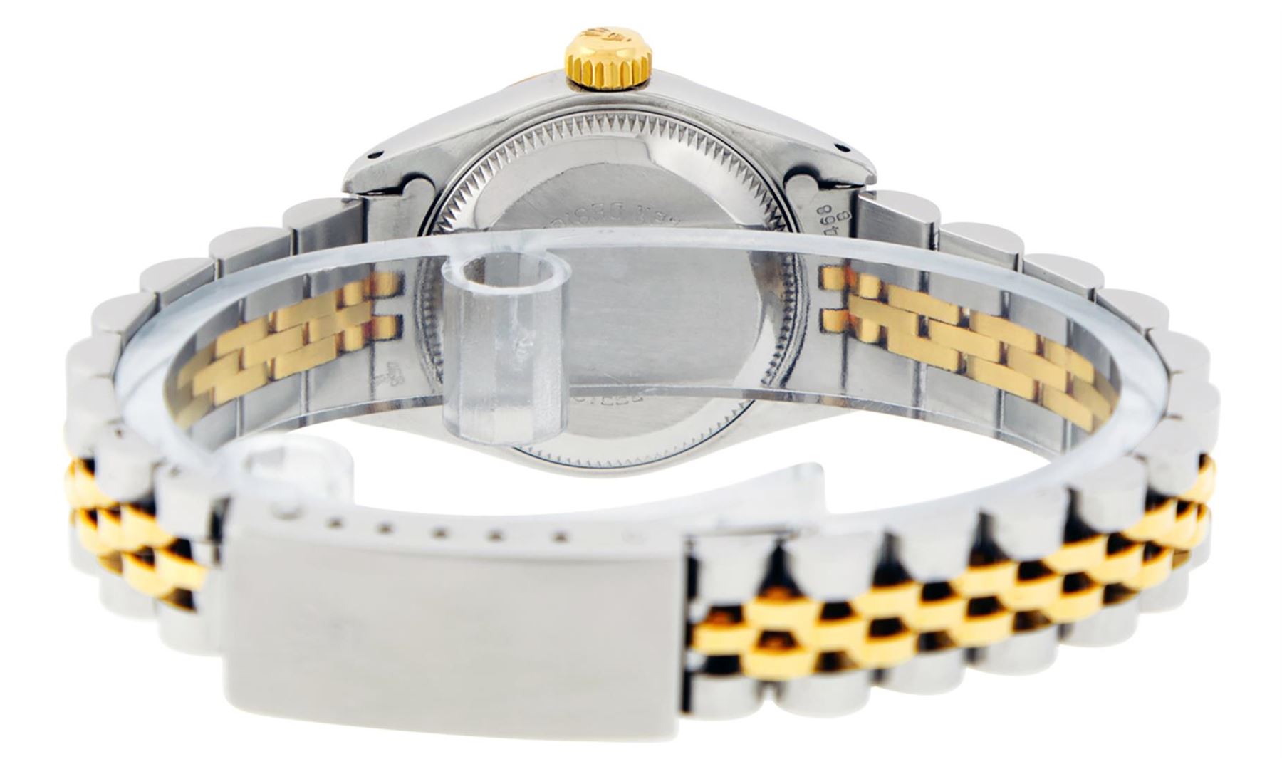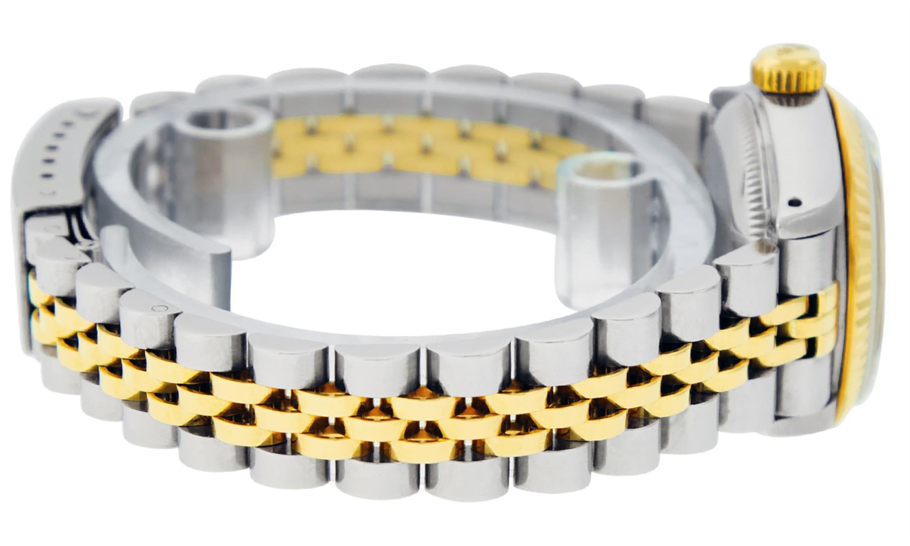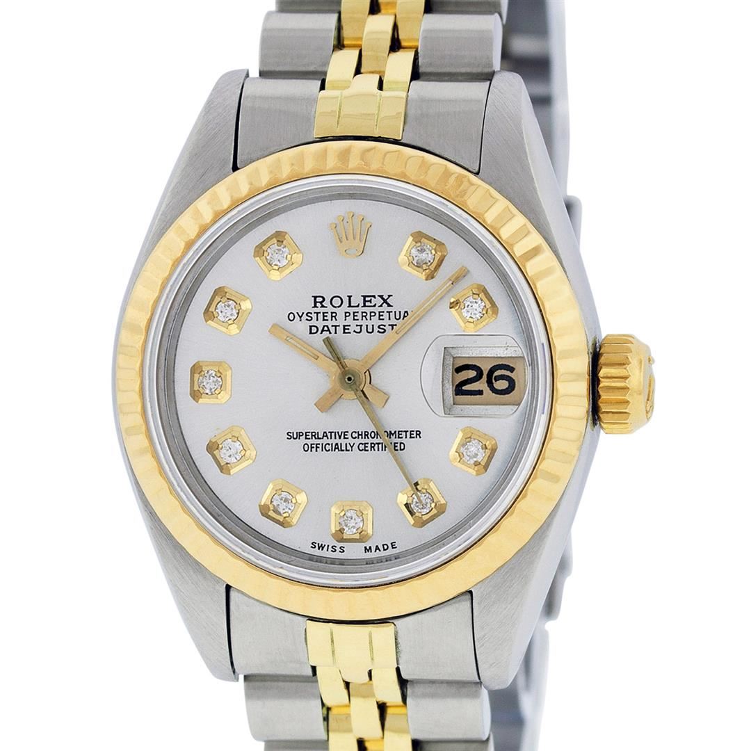 One Ladies 14K Two Tone Rolex Datejust Polished, Serviced & Electronically Tested, 14K Yellow Gold & Stainless Steel Case: 26mm, 14K Yellow Gold Crown, Bezel: 14K Yellow Gold Fluted Bezel. Custom Crystal: New Acrylic Cyclops Lens. Custom Hands: New Luminescent Hands. Movement: Automatic Winding Movement Caliber 2030. Custom Dial: Silver With Diamond Hour Markers, Diamond Count: 10 Diamonds, Color: G to H, Clarity: VS2-SI1. Date Window: 3 O'Clock Position Date Display, Model: Datejust. Condition: G-6 Extra Fine. Bracelet: Two Tone 14K Yellow Gold & Stainless Steel Jubilee Band. Bright Polish. 6.0 Inch Length, Adjustable. Standard Clasp, With Rolex Logo. This Watch Has Been Serviced Time Tested And Is In Excellent Condition It Is Free Of All Scratches And Dents.