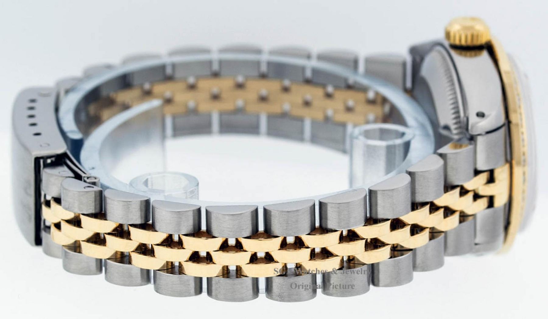 One Ladies 14K Two Tone Rolex Datejust Polished, Serviced & Electronically Tested, 14K Yellow Gold & Stainless Steel Case: 26mm, 14K Yellow Gold Crown, Custom Bezel: 18K Yellow Gold Beadset Diamond Bezel, Diamond Count: 32 Diamonds Total Weight .70 Carat, Clarity: Si-VS, Color: G to H. Custom Crystal: Synthetic Sapphire Cyclops Lens. Custom Hands: New Luminescent Hands. Movement: Automatic Winding Movement Caliber 2030. Custom Dial: Silver Dial Set With Diamond Hour Markers, 10 Diamond in Dial G To H In Color, Si-VS Clarity. Date Window: 3 O'Clock Position Date Display, Model: Datejust. Condition: G-6 Extra Fine. Bracelet: Two Tone 14K Yellow Gold & Stainless Steel Jubilee. Bright Polish. 6.0 Inch Length, Adjustable. Standard Clasp, With Rolex Logo. This Watch Has Been Serviced Time Tested And Is In Excellent Condition It Is Free Of All Scratches And Dents.