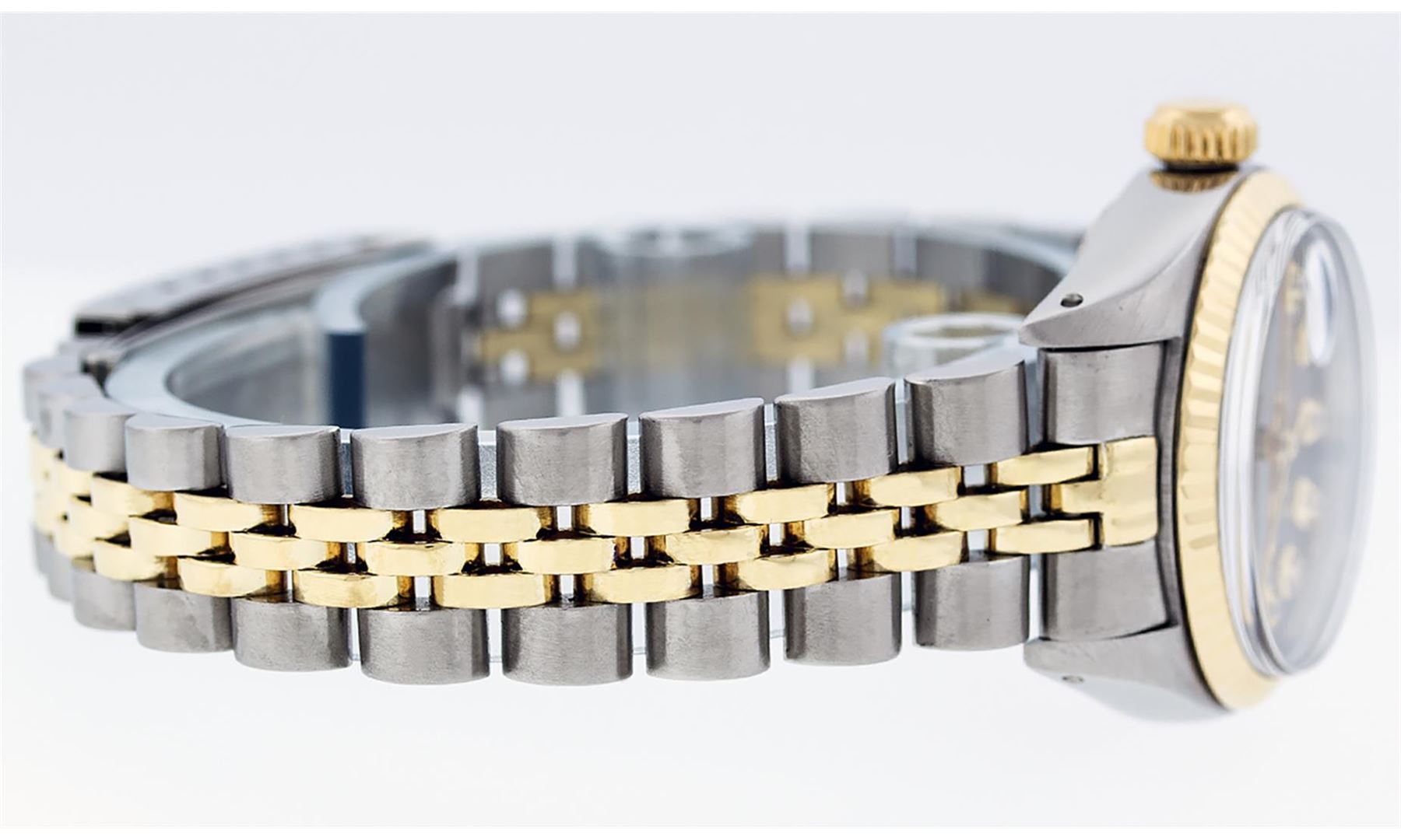 One Ladies 14K Two Tone Rolex Datejust Polished, Serviced & Electronically Tested, 14K Yellow Gold & Stainless Steel Case: 26mm, 14K Yellow Gold Crown, Bezel: 14K Yellow Gold Fluted Bezel. Custom Crystal: New Acrylic Cyclops Lens. Custom Hands: New Luminescent Hands. Movement: Automatic Winding Movement Caliber 2030. Custom Dial: Slate Grey With Diamond Hour Markers, Diamond Count: 10 Diamonds, Color: G to H, Clarity: VS2-SI1. Date Window: 3 O'Clock Position Date Display, Model: Datejust. Condition: G-6 Extra Fine. Bracelet: Two Tone 14K Yellow Gold & Stainless Steel Jubilee Band. Bright Polish. 6.0 Inch Length, Adjustable. Standard Clasp, With Rolex Logo. This Watch Has Been Serviced Time Tested And Is In Excellent Condition It Is Free Of All Scratches And Dents.