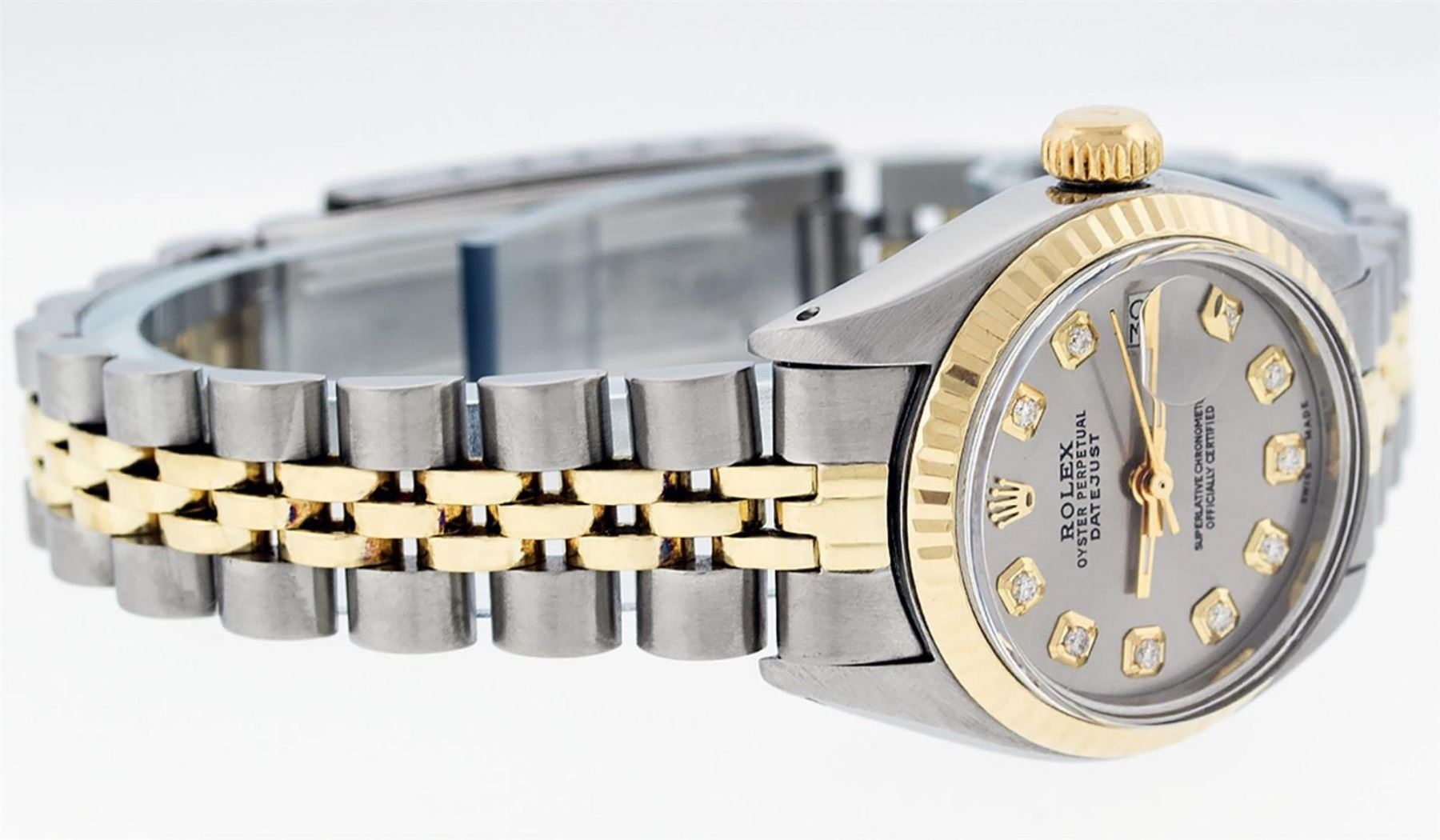One Ladies 14K Two Tone Rolex Datejust Polished, Serviced & Electronically Tested, 14K Yellow Gold & Stainless Steel Case: 26mm, 14K Yellow Gold Crown, Bezel: 14K Yellow Gold Fluted Bezel. Custom Crystal: New Acrylic Cyclops Lens. Custom Hands: New Luminescent Hands. Movement: Automatic Winding Movement Caliber 2030. Custom Dial: Slate Grey With Diamond Hour Markers, Diamond Count: 10 Diamonds, Color: G to H, Clarity: VS2-SI1. Date Window: 3 O'Clock Position Date Display, Model: Datejust. Condition: G-6 Extra Fine. Bracelet: Two Tone 14K Yellow Gold & Stainless Steel Jubilee Band. Bright Polish. 6.0 Inch Length, Adjustable. Standard Clasp, With Rolex Logo. This Watch Has Been Serviced Time Tested And Is In Excellent Condition It Is Free Of All Scratches And Dents.