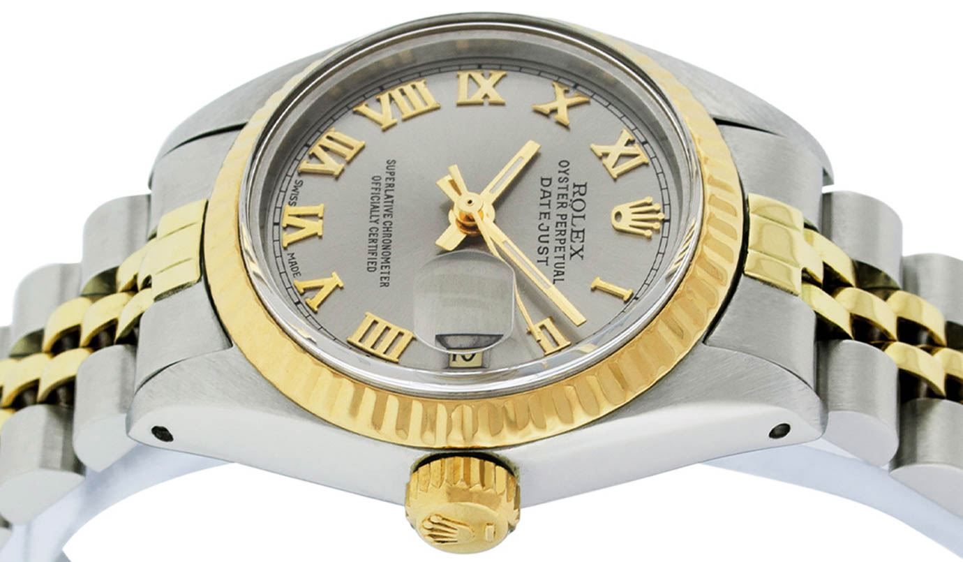 One Ladies 14K Two Tone Rolex Datejust Polished, Serviced & Electronically Tested, 14K Yellow Gold & Stainless Steel, Case Size: 26mm, 14K Yellow Gold Crown, Bezel: 14K Yellow Gold Fluted Bezel. Custom Crystal: New Acrylic Cyclops Lens. Custom Hands: New Luminescent Hands. Movement: Automatic Winding Movement Caliber 2030. Custom Dial: Slate Grey Roman Dial. Date Window: 3 O'Clock Position Date Display, Model: Datejust. Condition: G-6 Extra Fine. Bracelet: Two Tone 14K Yellow Gold & Stainless Steel Jubilee. Bright Polish. 6.0 Inch Length, Adjustable. Standard Clasp, With Rolex Logo. This Watch Has Been Serviced Time Tested And Is In Excellent Condition It Is Free Of All Scratches And Dents.