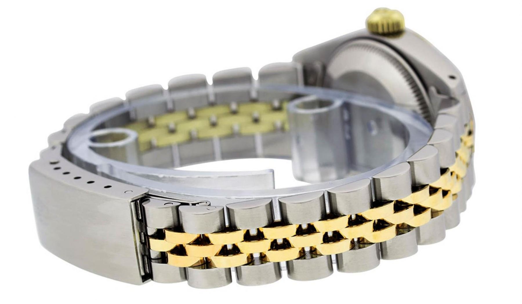 One Ladies 14K Two Tone Rolex Datejust Polished, Serviced & Electronically Tested, 14K Yellow Gold & Stainless Steel, Case Size: 26mm, 14K Yellow Gold Crown, Bezel: 14K Yellow Gold Fluted Bezel. Custom Crystal: New Acrylic Cyclops Lens. Custom Hands: New Luminescent Hands. Movement: Automatic Winding Movement Caliber 2030. Custom Dial: Slate Grey Roman Dial. Date Window: 3 O'Clock Position Date Display, Model: Datejust. Condition: G-6 Extra Fine. Bracelet: Two Tone 14K Yellow Gold & Stainless Steel Jubilee. Bright Polish. 6.0 Inch Length, Adjustable. Standard Clasp, With Rolex Logo. This Watch Has Been Serviced Time Tested And Is In Excellent Condition It Is Free Of All Scratches And Dents.