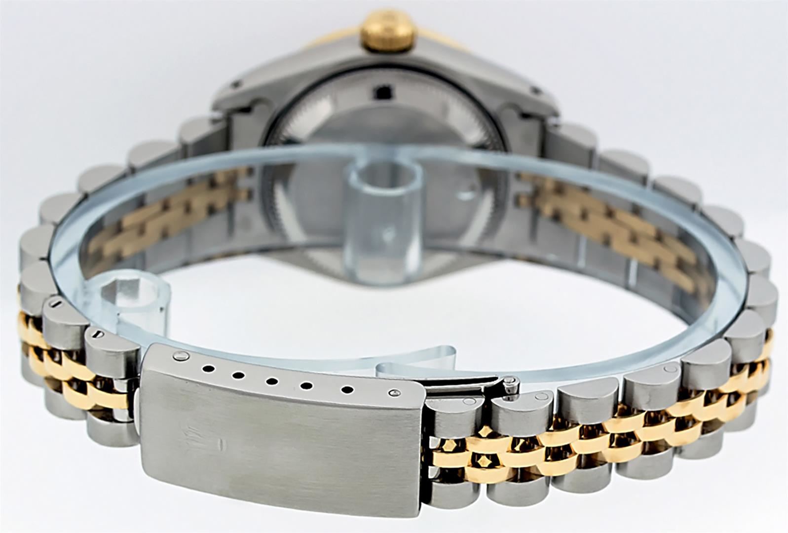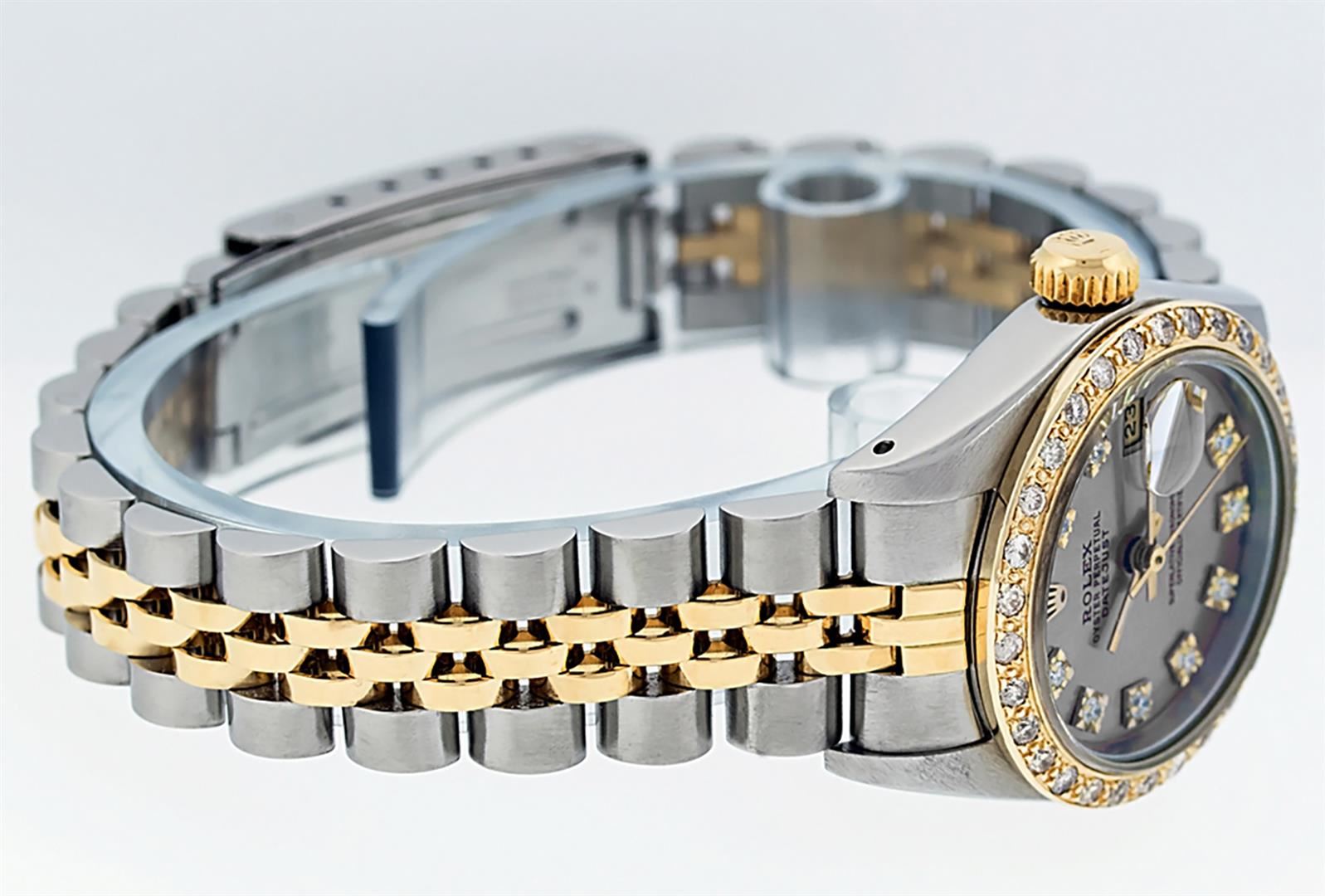 One Ladies 14K Two Tone Rolex Datejust Polished, Serviced & Electronically Tested, 14K Yellow Gold & Stainless Steel Case: 26mm, 14K Yellow Gold Crown, Custom Bezel: New 18K .70ctw Yellow Gold Beadset Diamond Bezel, Diamond Count: 32 Diamonds, Total Weight 1.00 Carat, Clarity: SI-VS, Color: G to H. Custom Crystal: New Scratch Resistant Synthetic Sapphire Cyclops Lens. Custom Hands: New Luminescent Hands. Movement: Automatic Winding Movement Caliber 2030. Custom Dial: Slate Grey VS Diamond Dial, Diamond Count: 10 Single Cut Diamonds in Dial, G To H In Color, VS Clarity. Date Window: 3 O'Clock Position Date Display, Model: Datejust, Condition: G-6 Extra Fine. Bracelet: Two Tone 14K Yellow Gold & Stainless Steel Jubilee. Bright Polish. 6.0 Inch Length, Adjustable. Standard Clasp, With Rolex Logo. This Watch Has Been Serviced Time Tested And Is In Excellent Condition It Is Free Of All Scratches And Dents.