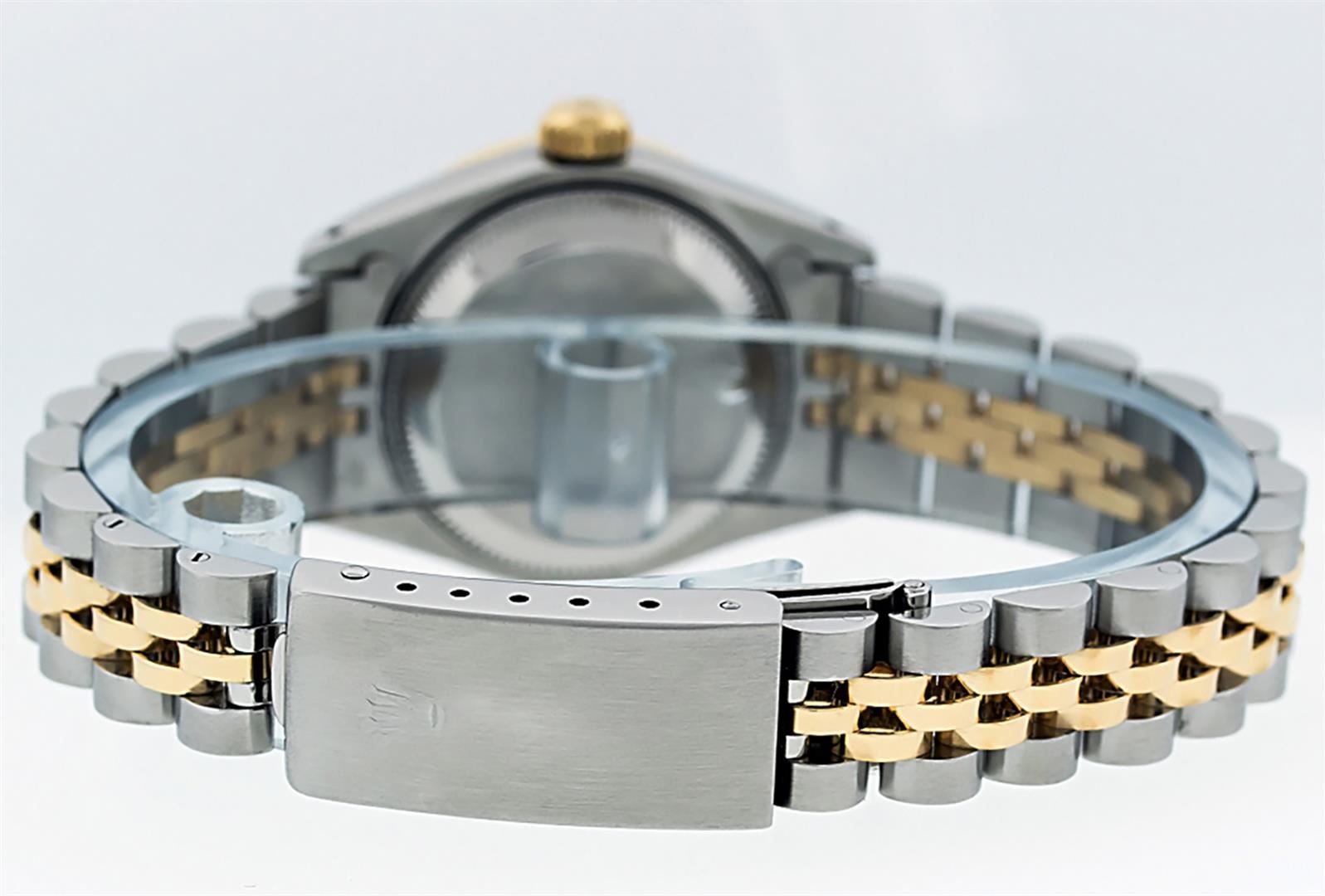 One Ladies 14K Two Tone Rolex Datejust Polished, Serviced & Electronically Tested, 14K Yellow Gold & Stainless Steel Case: 26mm, 14K Yellow Gold Crown, Custom Bezel: New 18K .70ctw Yellow Gold Beadset Diamond Bezel, Diamond Count: 32 Diamonds, Total Weight 1.00 Carat, Clarity: SI-VS, Color: G to H. Custom Crystal: New Scratch Resistant Synthetic Sapphire Cyclops Lens. Custom Hands: New Luminescent Hands. Movement: Automatic Winding Movement Caliber 2030. Custom Dial: Slate Grey VS Diamond Dial, Diamond Count: 10 Single Cut Diamonds in Dial, G To H In Color, VS Clarity. Date Window: 3 O'Clock Position Date Display, Model: Datejust, Condition: G-6 Extra Fine. Bracelet: Two Tone 14K Yellow Gold & Stainless Steel Jubilee. Bright Polish. 6.0 Inch Length, Adjustable. Standard Clasp, With Rolex Logo. This Watch Has Been Serviced Time Tested And Is In Excellent Condition It Is Free Of All Scratches And Dents.
