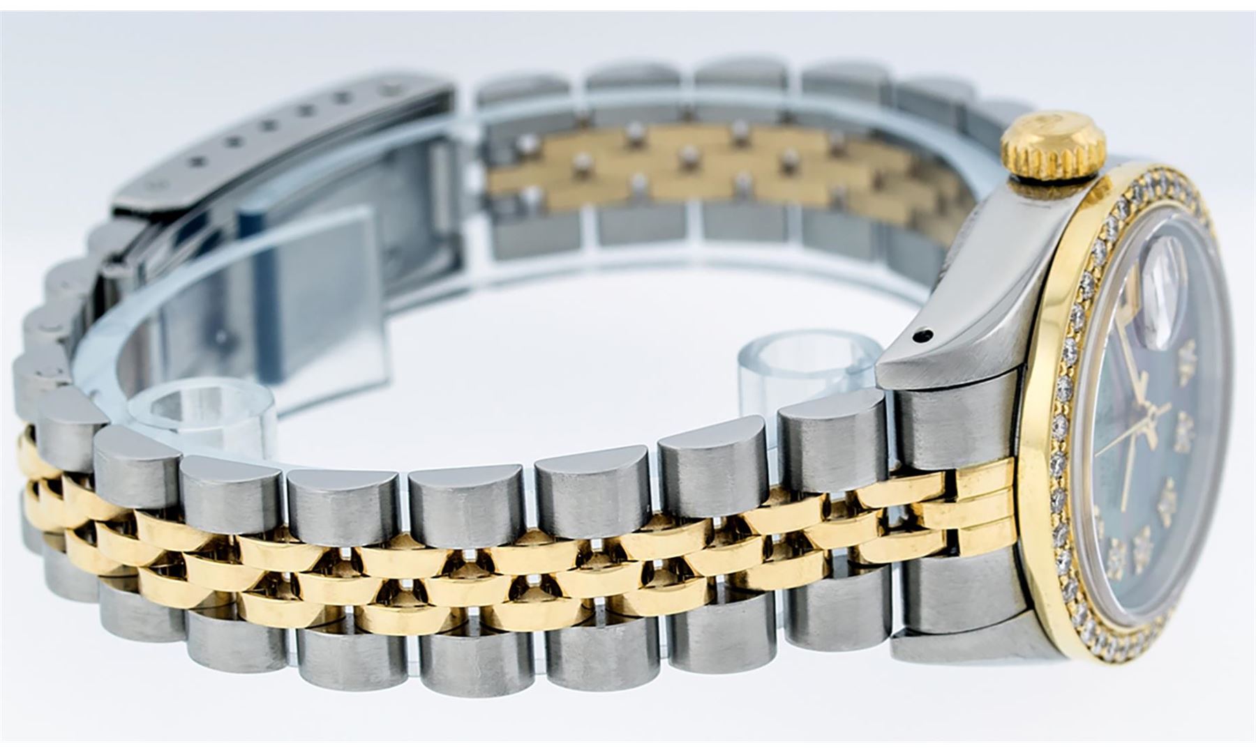 One Ladies 14K Two Tone Rolex Datejust Polished, Serviced & Electronically Tested, 14K Yellow Gold & Stainless Steel Case: 26mm, 14K Yellow Gold Crown, Custom Bezel: New 18K Yellow Gold Beadset Diamond Bezel, Diamond Count: 32 Diamonds On Bezel, Total Weight .70 Carat, Clarity: SI-VS, Color: G to H. Custom Crystal: New Scratch Resistant Synthetic Sapphire Cyclops Lens. Custom Hands: New Luminescent Hands. Movement: Automatic Winding Movement Caliber 2030. Custom Dial: Tahitian MOP With Single Cut Diamond Hour Markers, 10 Diamonds In Dial, G To H In Color, SI-VS Clarity. Date Window: 3 O'Clock Position Date Display, Model: Datejust. Condition: G-6 Extra Fine. Bracelet: Two Tone 14K Yellow Gold & Stainless Steel Jubilee Band. Bright Polish. 6.0 Inch Length, Adjustable. Standard Clasp, With Rolex Logo. This Watch Has Been Serviced Time Tested And Is In Excellent Condition It Is Free Of All Scratches And Dents.