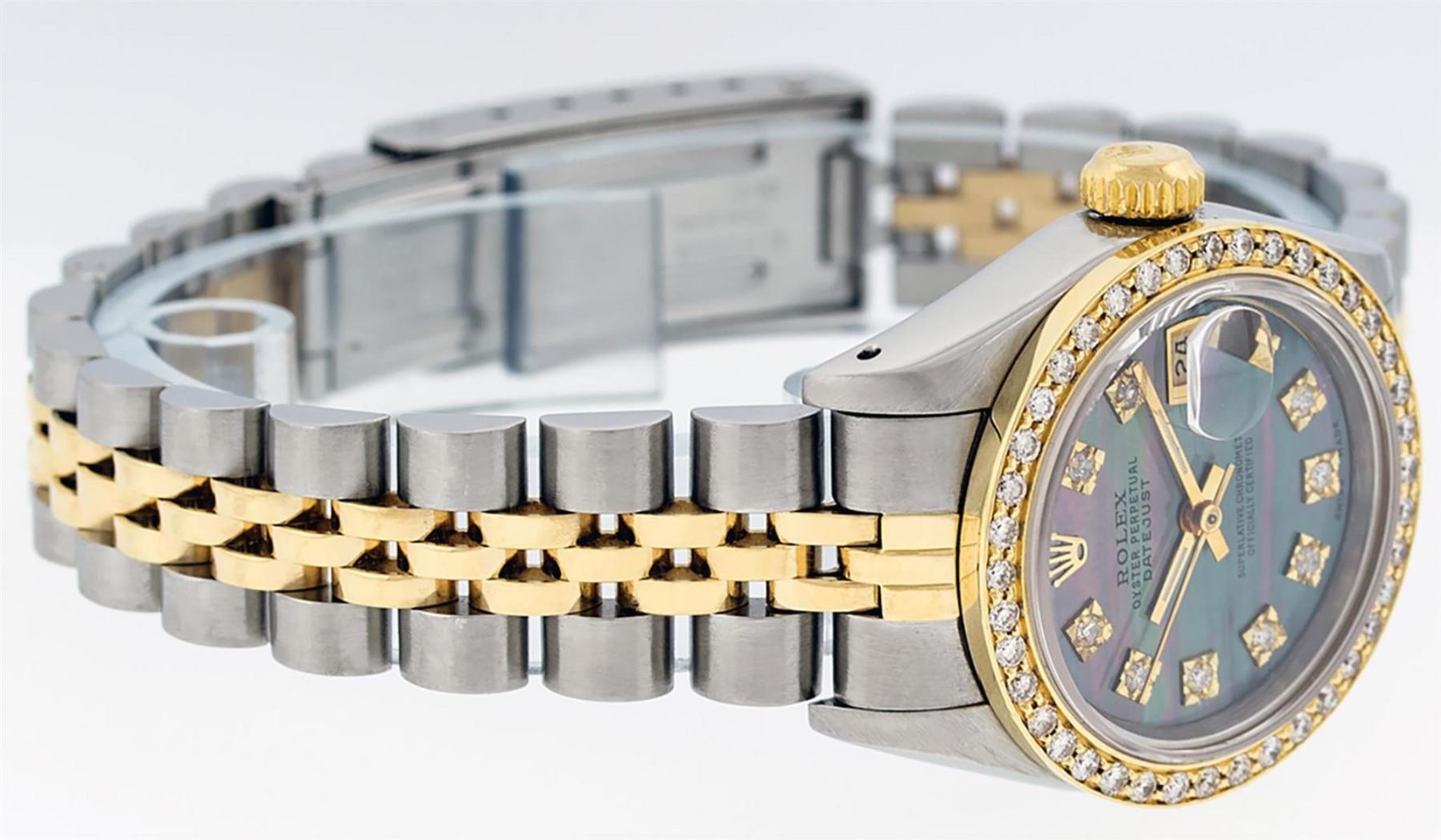 One Ladies 14K Two Tone Rolex Datejust Polished, Serviced & Electronically Tested, 14K Yellow Gold & Stainless Steel Case: 26mm, 14K Yellow Gold Crown, Custom Bezel: New 18K Yellow Gold� Beadset Diamond Bezel, Diamond Count: 32 Diamonds On Bezel, Total Weight .70 Carat, Clarity: SI-VS, Color: G to H. Custom Crystal: New Scratch Resistant Synthetic Sapphire Cyclops Lens. Custom Hands: New Luminescent Hands. Movement: Automatic Winding Movement Caliber 2030. Custom Dial: Tahitian MOP With Single Cut Diamond Hour Markers, 10 Diamonds In Dial, G To H In Color, SI-VS Clarity. Date Window: 3 O'Clock Position Date Display, Model: Datejust. Condition: G-6 Extra Fine. Bracelet: Two Tone 14K Yellow Gold & Stainless Steel Jubilee Band. Bright Polish. 6.0 Inch Length, Adjustable. Standard Clasp, With Rolex Logo. This Watch Has Been Serviced Time Tested And Is In Excellent Condition It Is Free Of All Scratches And Dents.