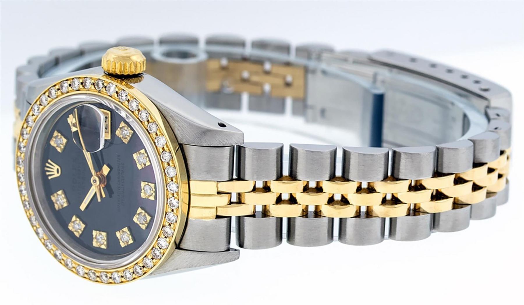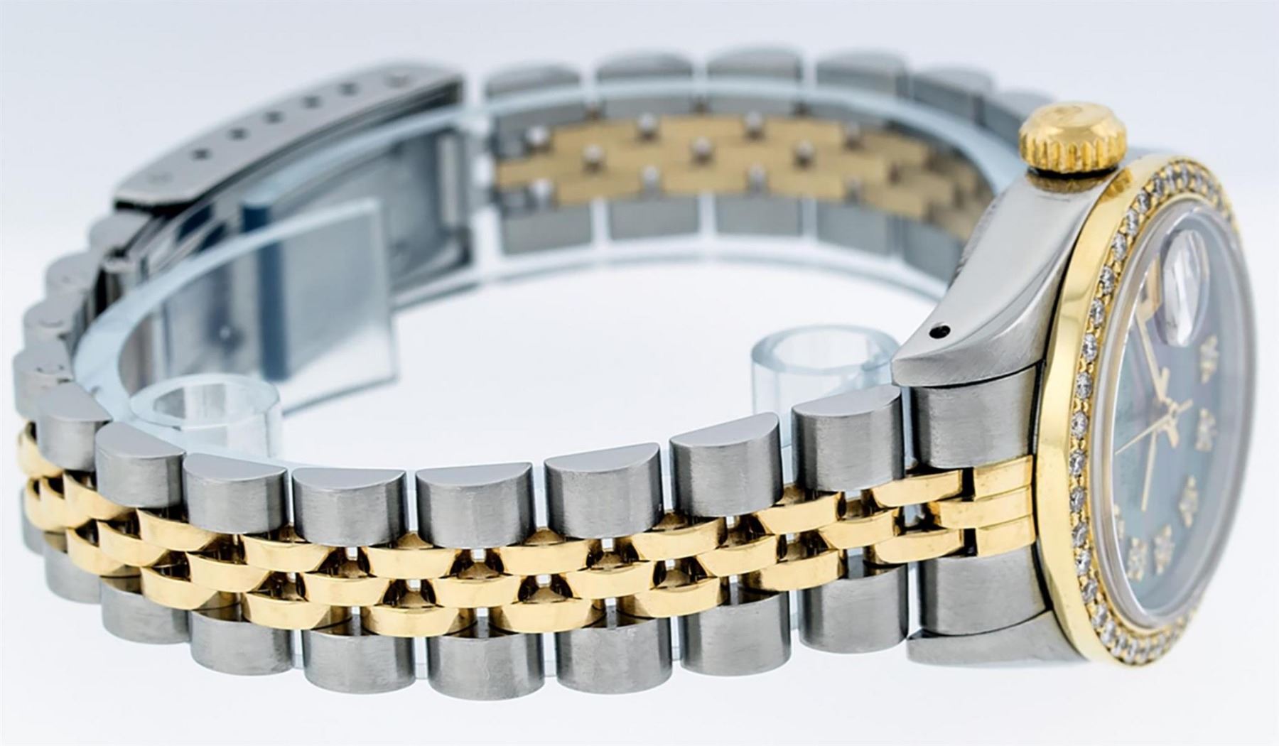 One Ladies 14K Two Tone Rolex Datejust Polished, Serviced & Electronically Tested, 14K Yellow Gold & Stainless Steel Case: 26mm, 14K Yellow Gold Crown, Custom Bezel: New 18K Yellow Gold� Beadset Diamond Bezel, Diamond Count: 32 Diamonds On Bezel, Total Weight .70 Carat, Clarity: SI-VS, Color: G to H. Custom Crystal: New Scratch Resistant Synthetic Sapphire Cyclops Lens. Custom Hands: New Luminescent Hands. Movement: Automatic Winding Movement Caliber 2030. Custom Dial: Tahitian MOP With Single Cut Diamond Hour Markers, 10 Diamonds In Dial, G To H In Color, SI-VS Clarity. Date Window: 3 O'Clock Position Date Display, Model: Datejust. Condition: G-6 Extra Fine. Bracelet: Two Tone 14K Yellow Gold & Stainless Steel Jubilee Band. Bright Polish. 6.0 Inch Length, Adjustable. Standard Clasp, With Rolex Logo. This Watch Has Been Serviced Time Tested And Is In Excellent Condition It Is Free Of All Scratches And Dents.