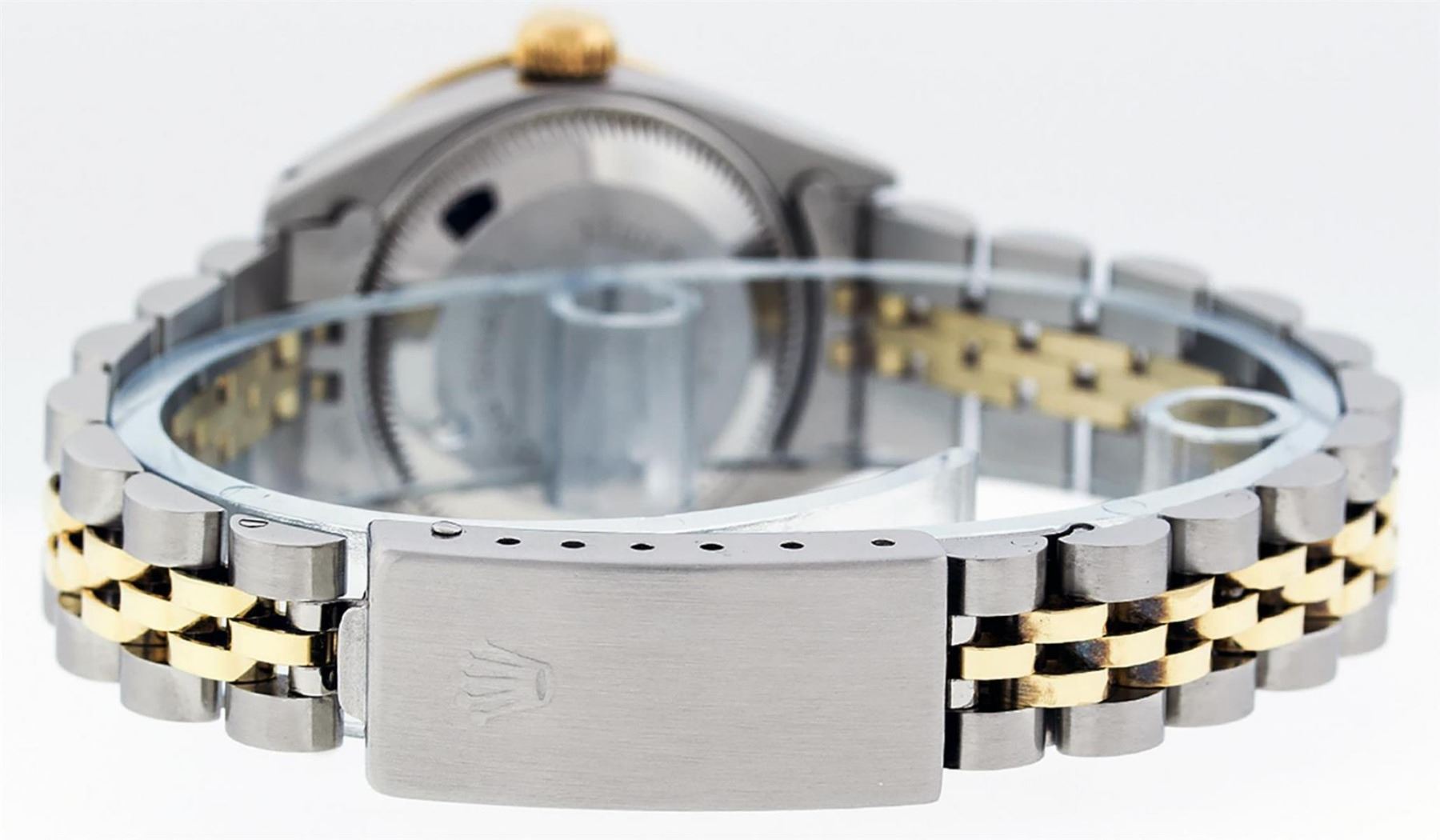 One Ladies 14K Two Tone Rolex Datejust Polished, Serviced & Electronically Tested, 14K Yellow Gold & Stainless Steel Case: 26mm, 14K Yellow Gold Crown, Custom Bezel: New 18K Yellow Gold� Beadset Diamond Bezel, Diamond Count: 32 Diamonds On Bezel, Total Weight .70 Carat, Clarity: SI-VS, Color: G to H. Custom Crystal: New Scratch Resistant Synthetic Sapphire Cyclops Lens. Custom Hands: New Luminescent Hands. Movement: Automatic Winding Movement Caliber 2030. Custom Dial: Tahitian MOP With Single Cut Diamond Hour Markers, 10 Diamonds In Dial, G To H In Color, SI-VS Clarity. Date Window: 3 O'Clock Position Date Display, Model: Datejust. Condition: G-6 Extra Fine. Bracelet: Two Tone 14K Yellow Gold & Stainless Steel Jubilee Band. Bright Polish. 6.0 Inch Length, Adjustable. Standard Clasp, With Rolex Logo. This Watch Has Been Serviced Time Tested And Is In Excellent Condition It Is Free Of All Scratches And Dents.