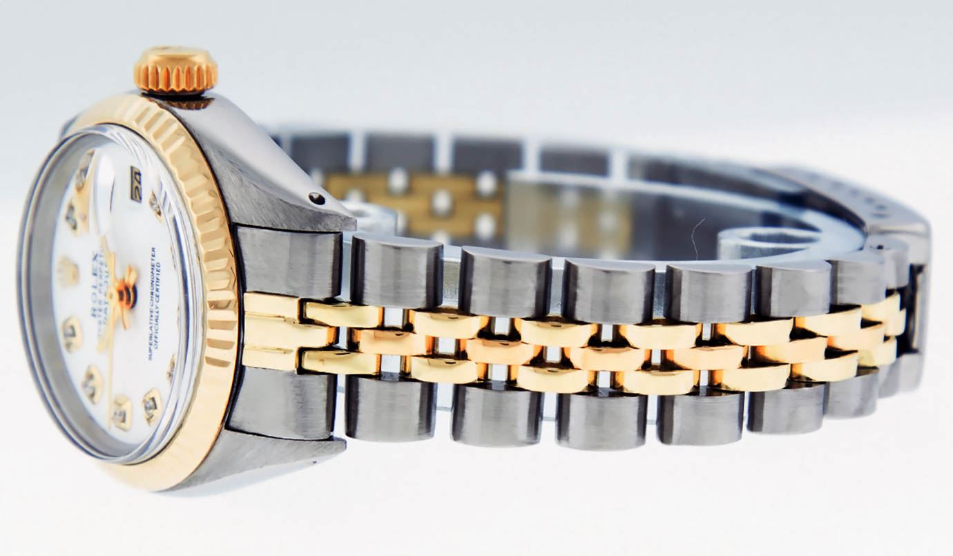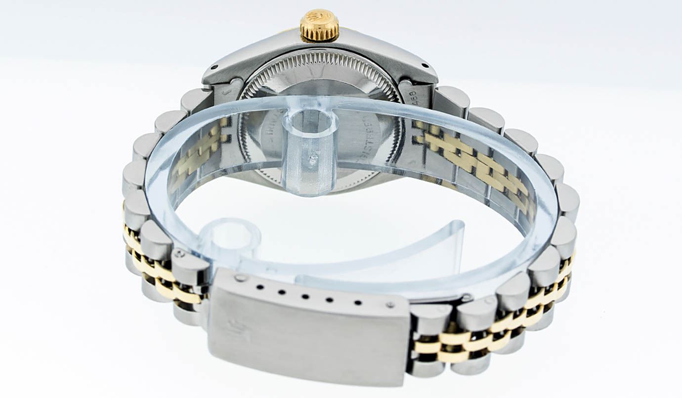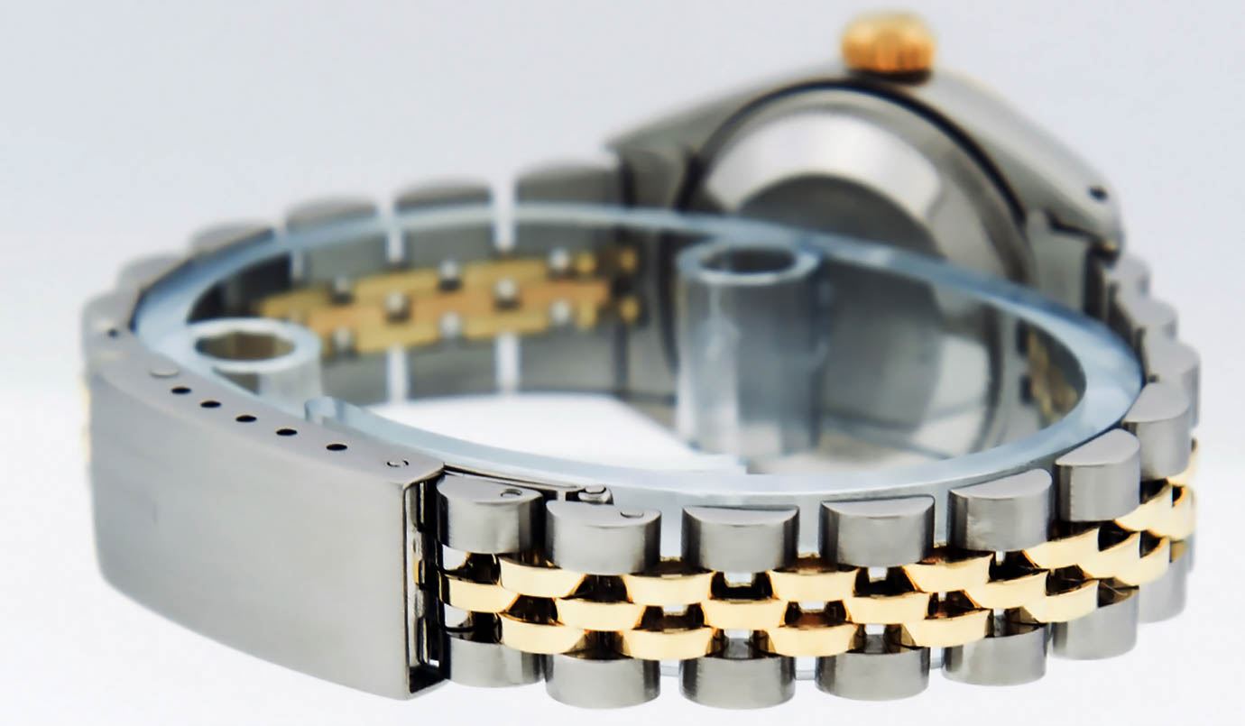 One Ladies 14K Two Tone Rolex Datejust Polished, Serviced & Electronically Tested, 14K Yellow Gold & Stainless Steel Case: 26mm, 14K Yellow Gold Crown, Bezel: 14K Yellow Gold Fluted Bezel. Custom Crystal: New Acrylic Cyclops Lens. Custom Hands: New Luminescent Hands. Movement: Automatic Winding Movement Caliber 2030. Custom Dial: Mother Of Pearl With Diamond Hour Markers, Diamond Count: 10 Diamonds, Color: G to H, Clarity: VS2-SI1. Date Window: 3 O'Clock Position Date Display, Model: Datejust. Condition: G-6 Extra Fine. Bracelet: Two Tone 14K Yellow Gold & Stainless Steel Jubilee. Bright Polish. 6.0 Inch Length, Adjustable. Standard Clasp, With Rolex Logo. This Watch Has Been Serviced Time Tested And Is In Excellent Condition It Is Free Of All Scratches And Dents.