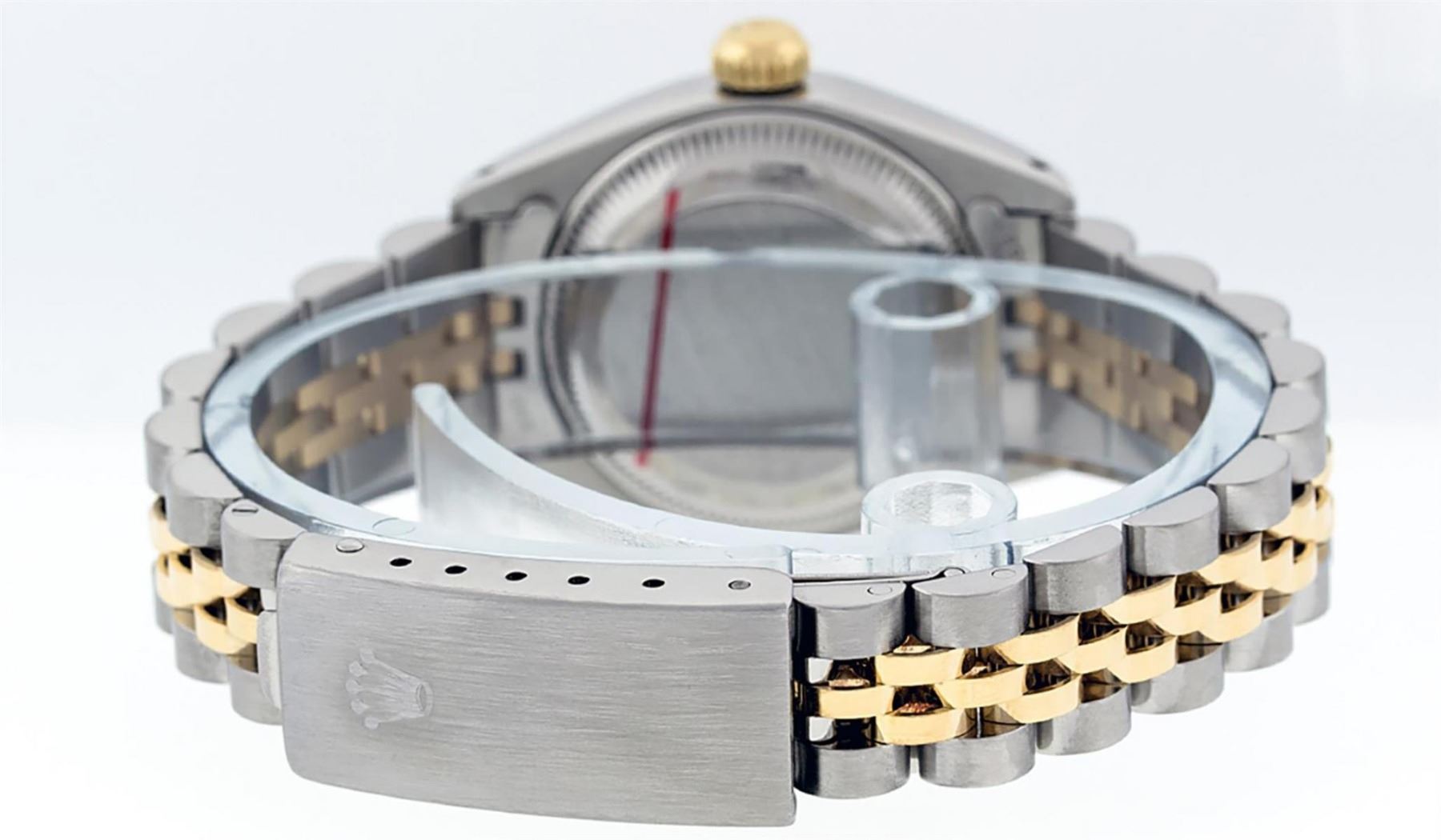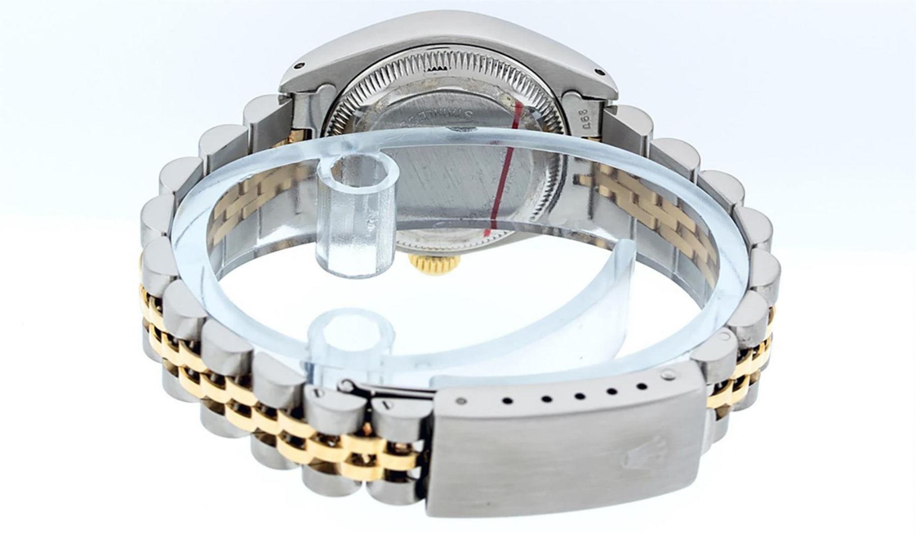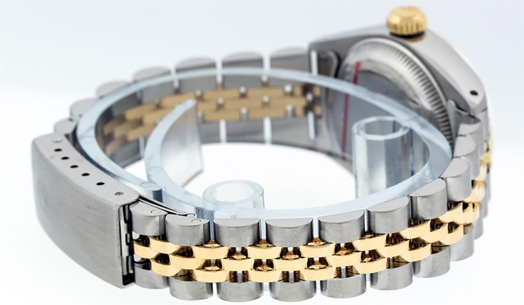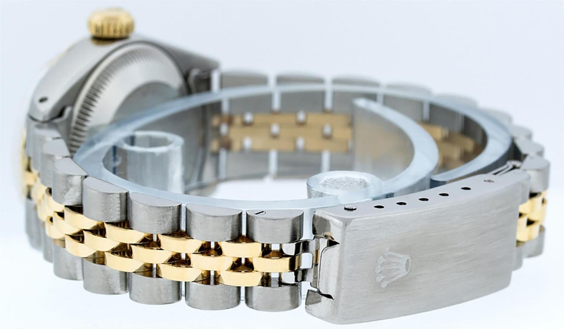 One Ladies 14K Two Tone Rolex Datejust Polished, Serviced & Electronically Tested, 14K Yellow Gold & Stainless Steel Case: 26mm, 14K Yellow Gold Crown, Bezel: 14K Yellow Gold Fluted Bezel. Custom Crystal: New Acrylic Cyclops Lens. Custom Hands: New Luminescent Hands. Movement: Automatic Winding Movement Caliber 2030. Custom Dial: White Index With Dash Track & Lumi Dots. Date Window: 3 O'Clock Position Date Display, Model: Datejust. Condition: G-6 Extra Fine. Bracelet: Two Tone 14K Yellow Gold & Stainless Steel Jubilee Band. Bright Polish. 6.0 Inch Length, Adjustable. Standard Clasp, With Rolex Logo. This Watch Has Been Serviced Time Tested And Is In Excellent Condition It Is Free Of All Scratches And Dents.