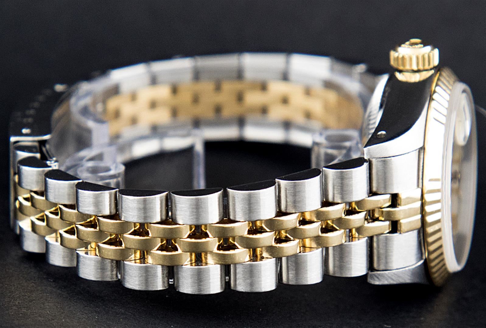 One Ladies 14K Two Tone Rolex Datejust Polished, Serviced & Electronically Tested, 14K Yellow Gold & Stainless Steel Case: 26mm, 14K Yellow Gold Crown, Bezel: 14K Yellow Gold Fluted Bezel. Custom Crystal: New Acrylic Cyclops Lens. Custom Hands: New Luminescent Hands. Movement: Automatic Winding Movement Caliber 2030. Custom Dial: White Index With Dash Track. Date Window: 3 O'Clock Position Date Display, Model: Datejust. Condition: G-6 Extra Fine. Bracelet: Two Tone 14K Yellow Gold & Stainless Steel Jubilee Band. Bright Polish. 6.0 Inch Length, Adjustable. Standard Clasp, With Rolex Logo. This Watch Has Been Serviced Time Tested And Is In Excellent Condition It Is Free Of All Scratches And Dents. This Watch Comes With A Rolex Box