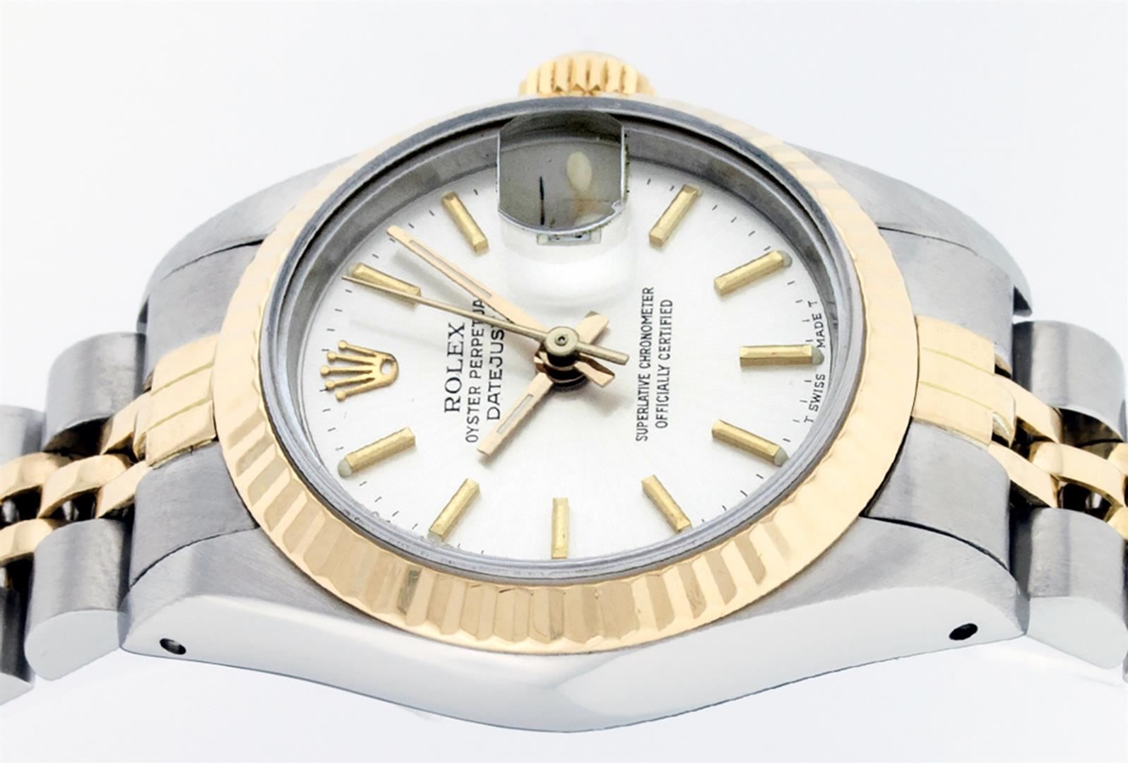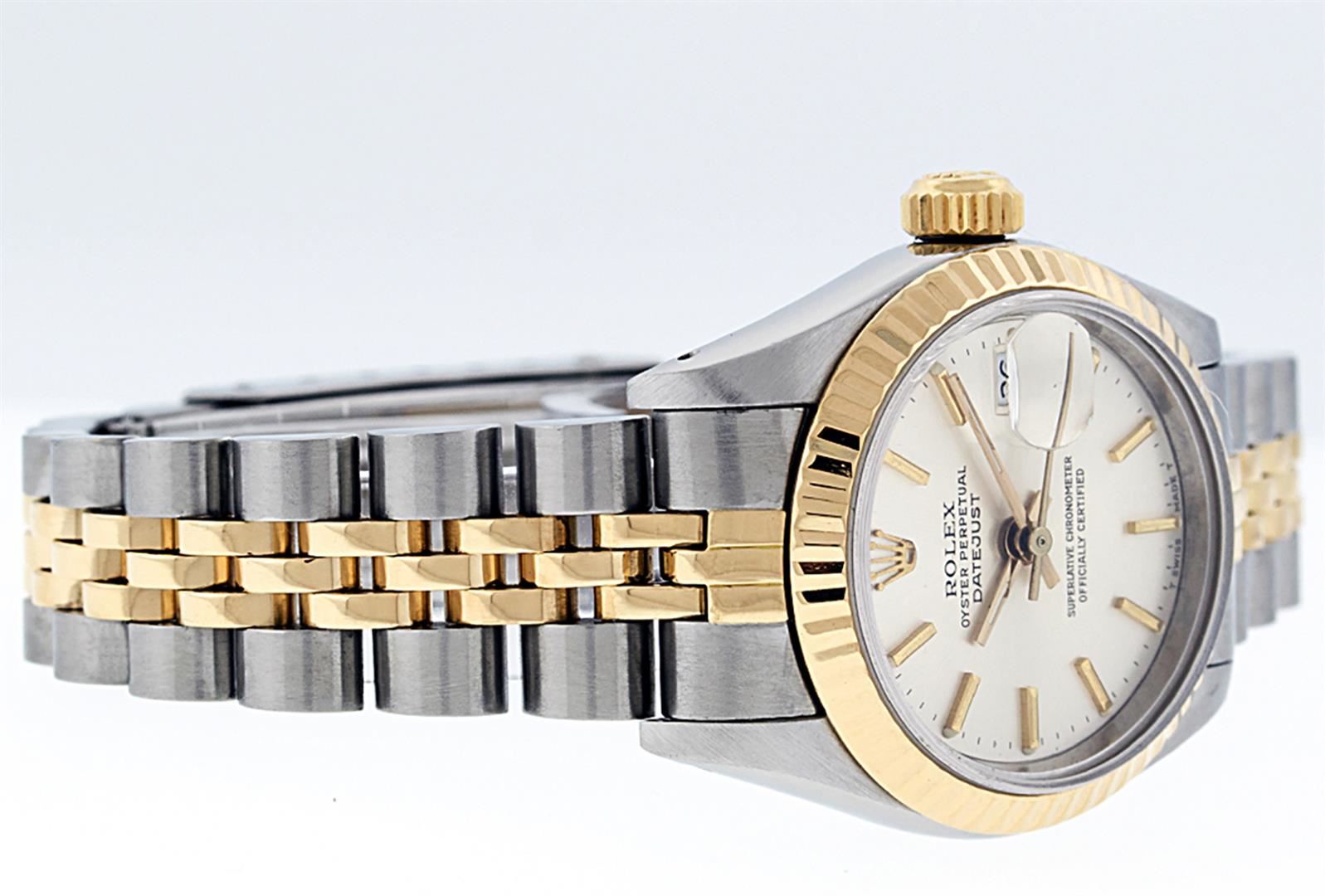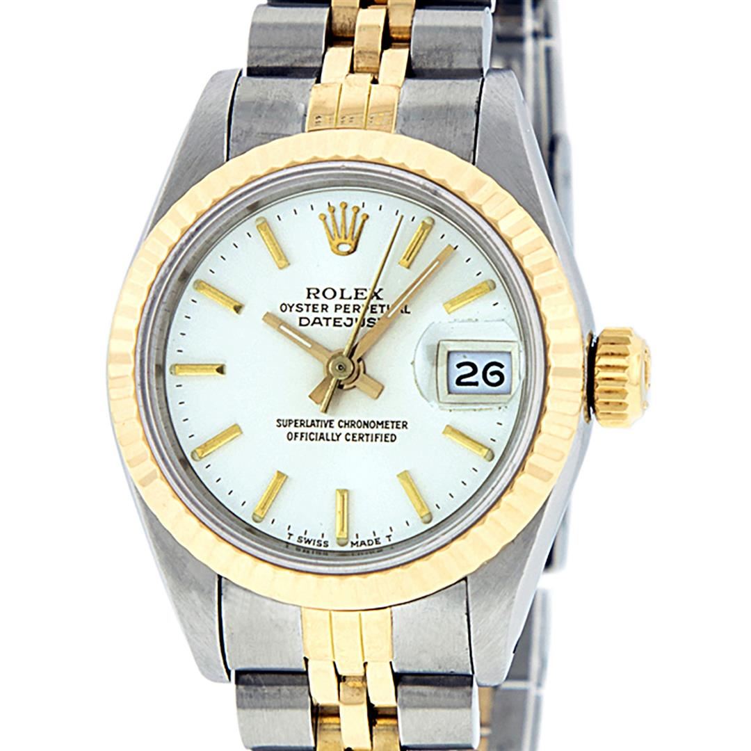 One Ladies 14K Two Tone Rolex Datejust Polished, Serviced & Electronically Tested, 14K Yellow Gold & Stainless Steel Case: 26mm, 14K Yellow Gold Crown, Bezel: 14K Yellow Gold Fluted Bezel. Custom Crystal: New Acrylic Cyclops Lens. Custom Hands: New Luminescent Hands. Movement: Automatic Winding Movement Caliber 2030. Custom Dial: White Index With Dash Track & Lumi Dots. Date Window: 3 O'Clock Position Date Display, Model: Datejust. Condition: G-6 Extra Fine. Bracelet: Two Tone 14K Yellow Gold & Stainless Steel Jubilee Band. Bright Polish. 6.0 Inch Length, Adjustable. Standard Clasp, With Rolex Logo. This Watch Has Been Serviced Time Tested And Is In Excellent Condition It Is Free Of All Scratches And Dents.
