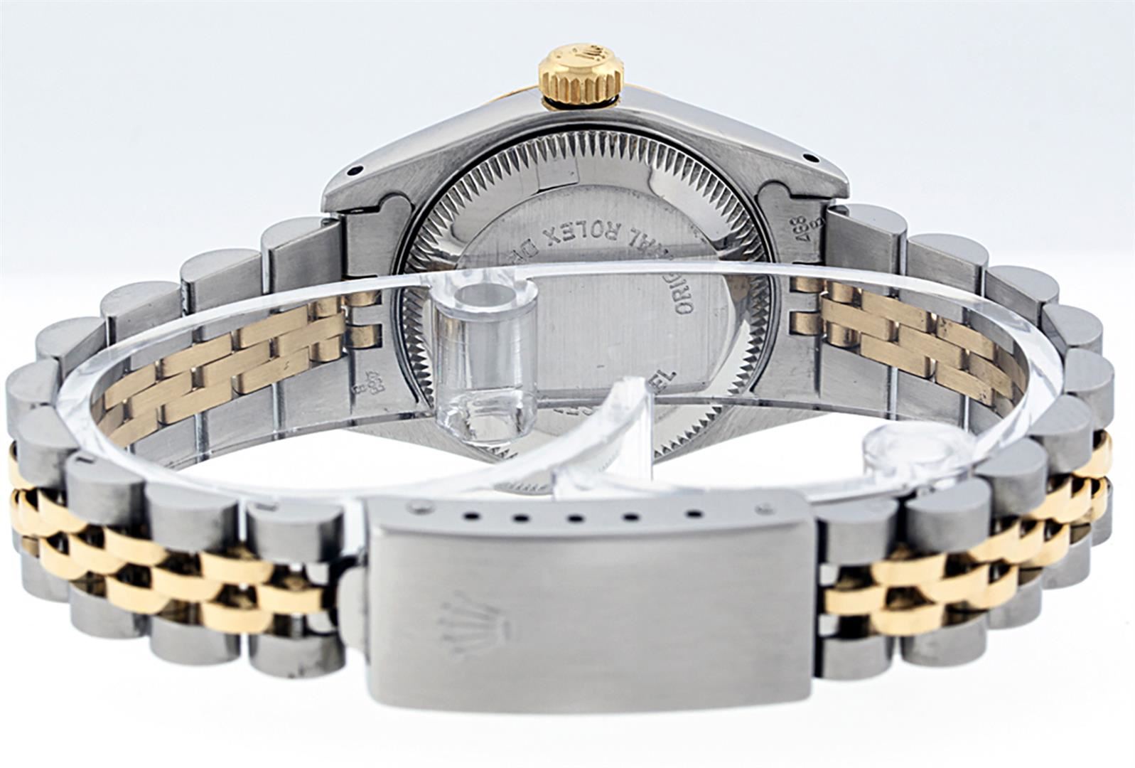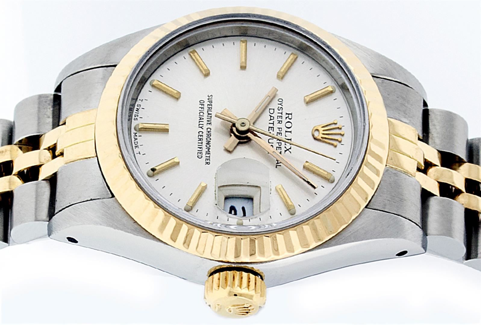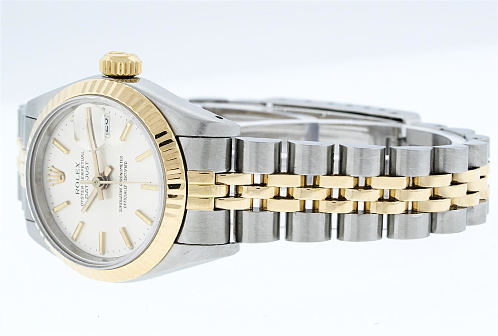 One Ladies 14K Two Tone Rolex Datejust Polished, Serviced & Electronically Tested, 14K Yellow Gold & Stainless Steel Case: 26mm, 14K Yellow Gold Crown, Bezel: 14K Yellow Gold Fluted Bezel. Custom Crystal: New Acrylic Cyclops Lens. Custom Hands: New Luminescent Hands. Movement: Automatic Winding Movement Caliber 2030. Custom Dial: White Index With Dash Track & Lumi Dots. Date Window: 3 O'Clock Position Date Display, Model: Datejust. Condition: G-6 Extra Fine. Bracelet: Two Tone 14K Yellow Gold & Stainless Steel Jubilee Band. Bright Polish. 6.0 Inch Length, Adjustable. Standard Clasp, With Rolex Logo. This Watch Has Been Serviced Time Tested And Is In Excellent Condition It Is Free Of All Scratches And Dents.