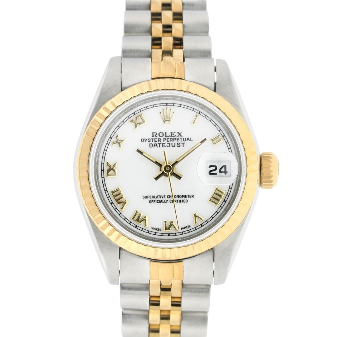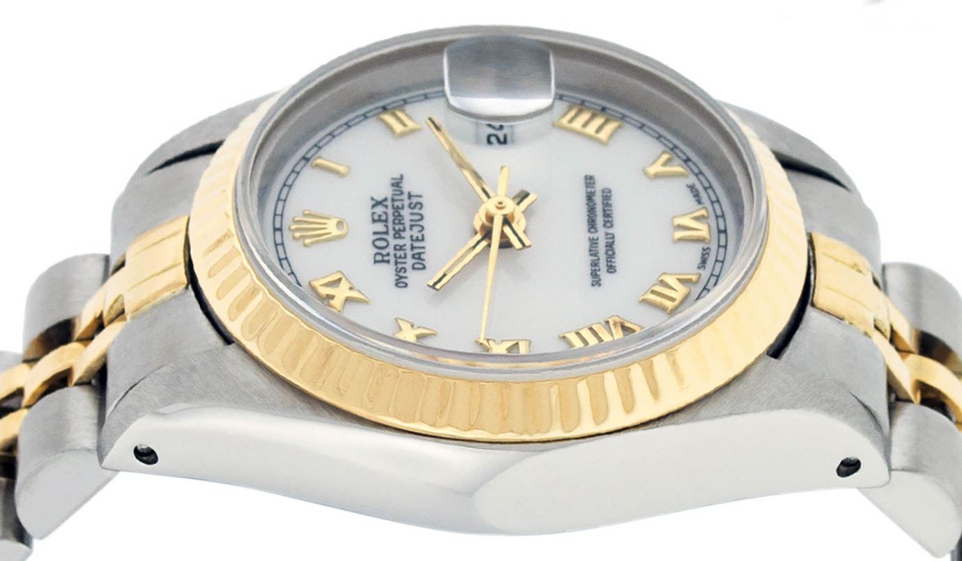 One Ladies 14K Two Tone Rolex Datejust Polished, Serviced & Electronically Tested, 14K Yellow Gold & Stainless Steel, Case Size: 26mm, 14K Yellow Gold Crown, Bezel: 14K Yellow Gold Fluted Bezel. Custom Crystal: New Acrylic Cyclops Lens. Custom Hands: New Luminescent Hands. Movement: Automatic Winding Movement Caliber 2030. Custom Dial: White Roman Dial. Date Window: 3 O'Clock Position Date Display, Model: Datejust. Condition: G-6 Extra Fine. Bracelet: Two Tone 14K Yellow Gold & Stainless Steel Jubilee. Bright Polish. 6.0 Inch Length, Adjustable. Standard Clasp, With Rolex Logo. This Watch Has Been Serviced Time Tested And Is In Excellent Condition It Is Free Of All Scratches And Dents.