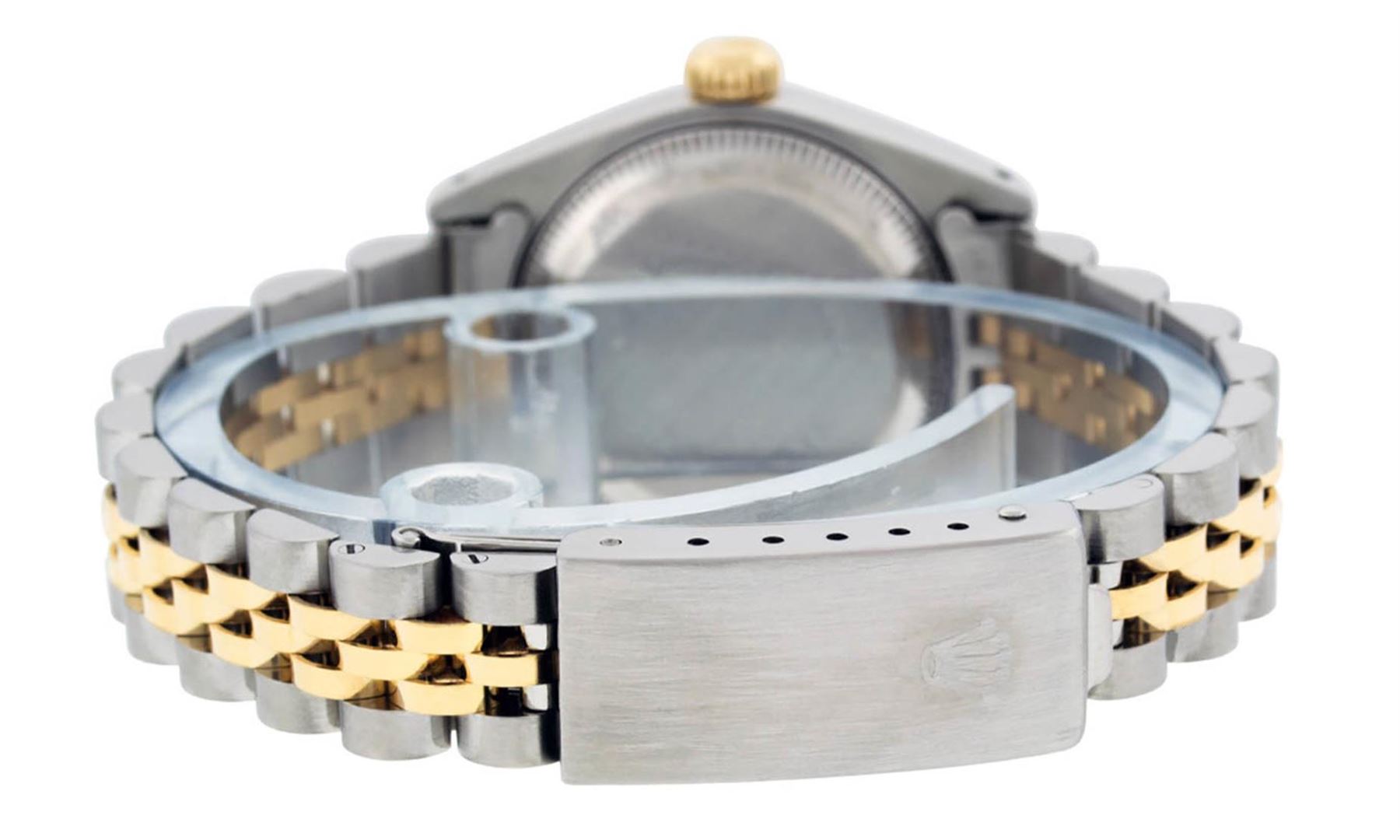 One Ladies 14K Two Tone Rolex Datejust Polished, Serviced & Electronically Tested, 14K Yellow Gold & Stainless Steel, Case Size: 26mm, 14K Yellow Gold Crown, Bezel: 14K Yellow Gold Fluted Bezel. Custom Crystal: New Acrylic Cyclops Lens. Custom Hands: New Luminescent Hands. Movement: Automatic Winding Movement Caliber 2030. Custom Dial: White Roman Dial. Date Window: 3 O'Clock Position Date Display, Model: Datejust. Condition: G-6 Extra Fine. Bracelet: Two Tone 14K Yellow Gold & Stainless Steel Jubilee. Bright Polish. 6.0 Inch Length, Adjustable. Standard Clasp, With Rolex Logo. This Watch Has Been Serviced Time Tested And Is In Excellent Condition It Is Free Of All Scratches And Dents.