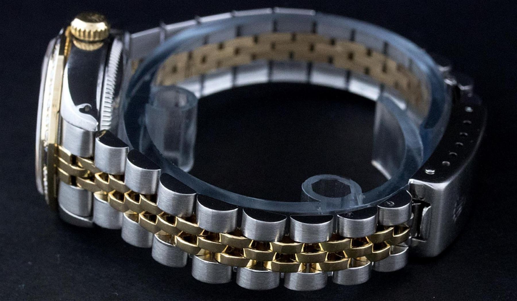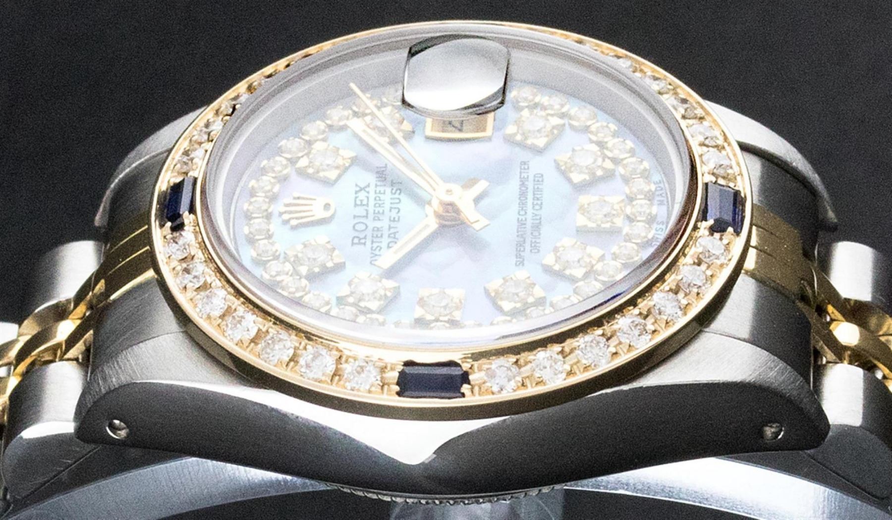 One Ladies 14K Two Tone Rolex Datejust Polished, Serviced & Electronically Tested, 14K Yellow Gold & Stainless Steel Case: 26mm, 14K Yellow Gold Crown, Custom Bezel: New 18K New Yellow Gold Beadset + Sapphire Diamond Bezel, Stone Count: 28 Diamonds + 4 Sapphires On Bezel, Total Weight .70 Carat, Clarity: SI-VS, Color: G to H. Custom Crystal: New Scratch Resistant Synthetic Sapphire Cyclops Lens. Custom Hands: New Luminescent Hands. Movement: Automatic Winding Movement Caliber 2030. Custom Dial: Blue Mother Of Pearl With String Single Cut Diamond Hour Markers, Diamond Count: 43 Diamonds On Dial, Clarity: SI-VS, Color: VS2. Date Window: 3 O'Clock Position Date Display, Model: Datejust. Condition: G-6 Extra Fine. Bracelet: Two Tone 14K Yellow Gold & Stainless Steel Jubilee Band. Bright Polish. 6.0 Inch Length, Adjustable. Standard Clasp, With Rolex Logo. This Watch Has Been Serviced Time Tested And Is In Excellent Condition It Is Free Of All Scratches And Dents.