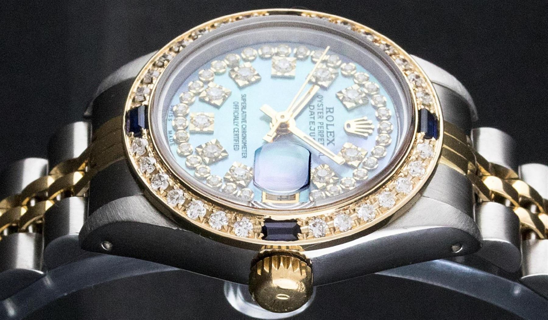 One Ladies 14K Two Tone Rolex Datejust Polished, Serviced & Electronically Tested, 14K Yellow Gold & Stainless Steel Case: 26mm, 14K Yellow Gold Crown, Custom Bezel: New 18K New Yellow Gold Beadset + Sapphire Diamond Bezel, Stone Count: 28 Diamonds + 4 Sapphires On Bezel, Total Weight .70 Carat, Clarity: SI-VS, Color: G to H. Custom Crystal: New Scratch Resistant Synthetic Sapphire Cyclops Lens. Custom Hands: New Luminescent Hands. Movement: Automatic Winding Movement Caliber 2030. Custom Dial: Blue Mother Of Pearl With String Single Cut Diamond Hour Markers, Diamond Count: 43 Diamonds On Dial, Clarity: SI-VS, Color: VS2. Date Window: 3 O'Clock Position Date Display, Model: Datejust. Condition: G-6 Extra Fine. Bracelet: Two Tone 14K Yellow Gold & Stainless Steel Jubilee Band. Bright Polish. 6.0 Inch Length, Adjustable. Standard Clasp, With Rolex Logo. This Watch Has Been Serviced Time Tested And Is In Excellent Condition It Is Free Of All Scratches And Dents.
