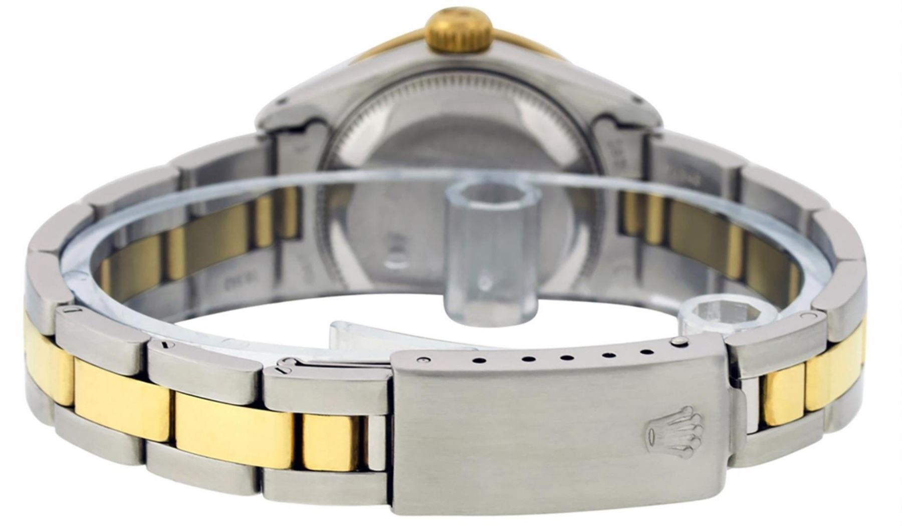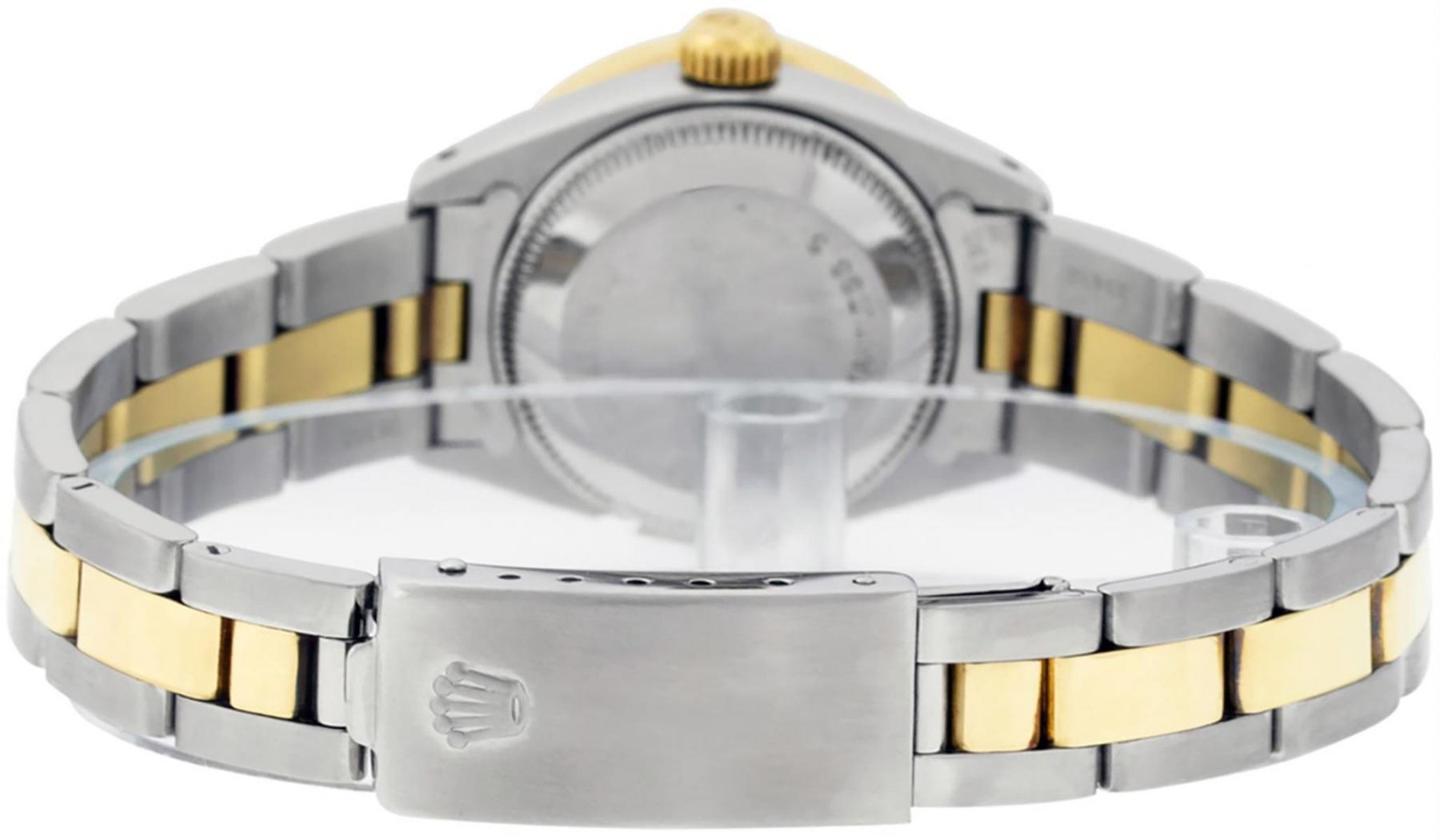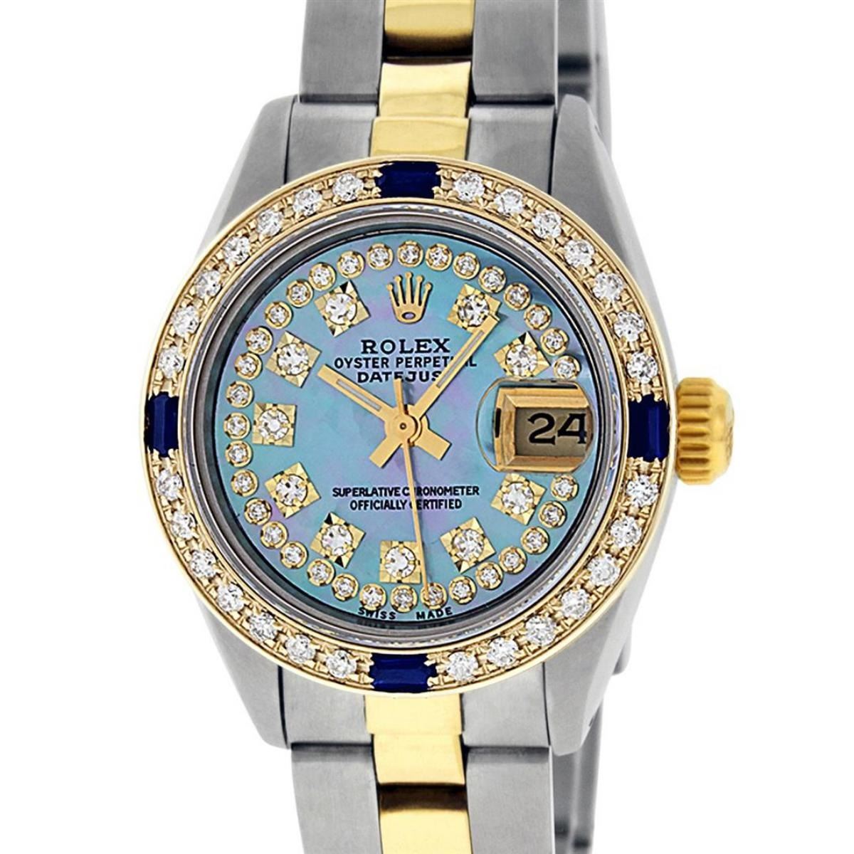 One Ladies Two Tone Rolex Datejust Polished, Serviced & Electronically Tested, Yellow Gold & Stainless Steel Case: 26mm, Yellow Gold Crown, Custom Bezel: New 18K New Yellow Gold Beadset + Sapphire Diamond Bezel, Stone Count: 28 Diamonds + 4 Sapphires In Bezel, Total Weight .70 Carat, Clarity: SI-VS, Color: G to H. Custom Crystal: New Scratch Resistant Synthetic Sapphire Cyclops Lens. Custom Hands: New Luminescent Hands. Movement: Automatic Winding Movement. Custom Dial: Blue MOP String With Diamond Hour Markers, Diamond Count: 43 Diamonds On Dial, Clarity: SI-VS, Color: VS2. Date Window: 3 O'Clock Position Date Display, Model: Datejust. Condition: G-6 Extra Fine. Bracelet: Two Tone Yellow Gold & Stainless Steel Oyster Band. Bright Polish. 6.0 Inch Length, Adjustable. Standard Clasp, With Rolex Logo. This Watch Has Been Serviced Time Tested And Is In Excellent Condition It Is Free Of All Scratches And Dents.