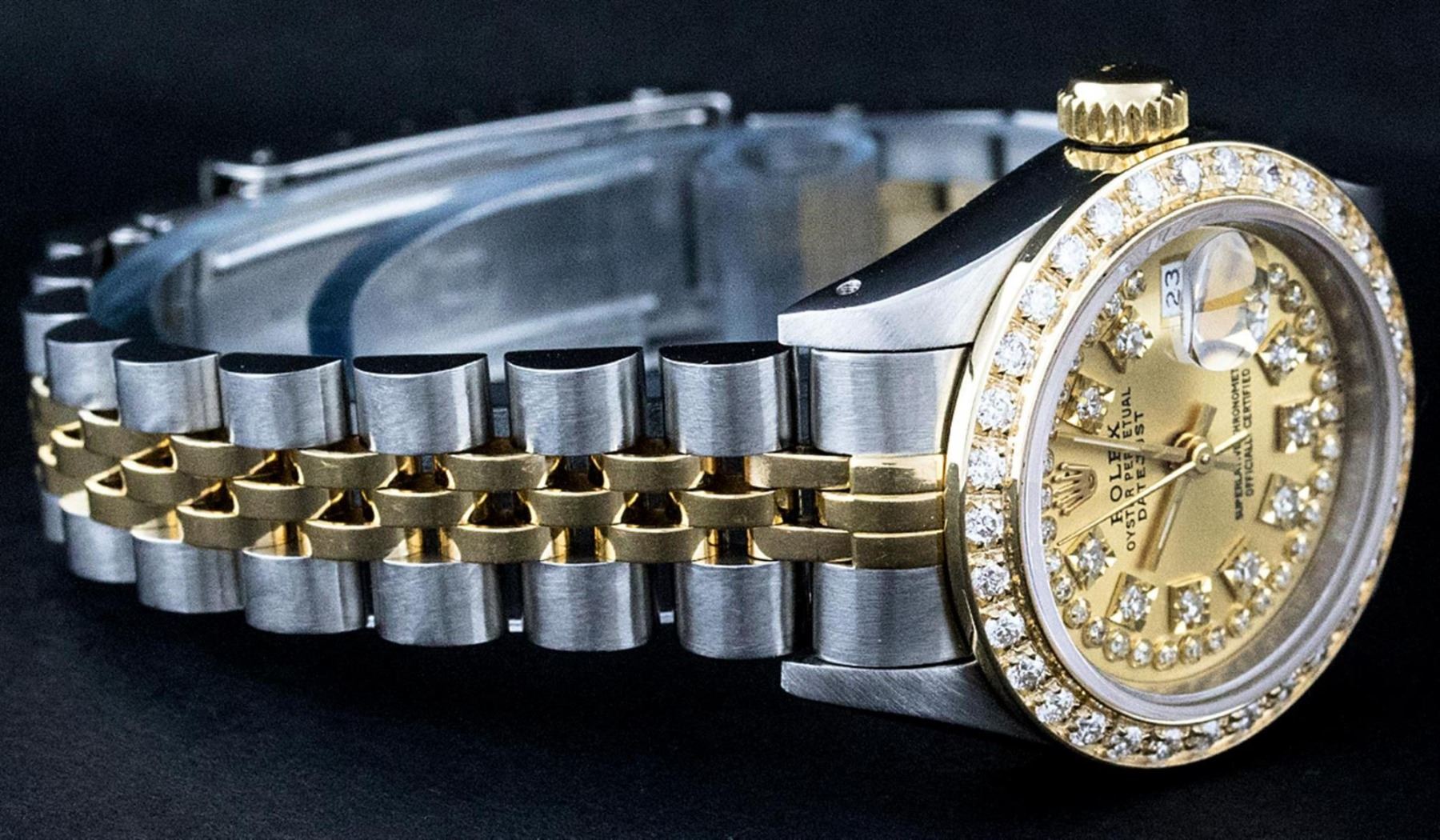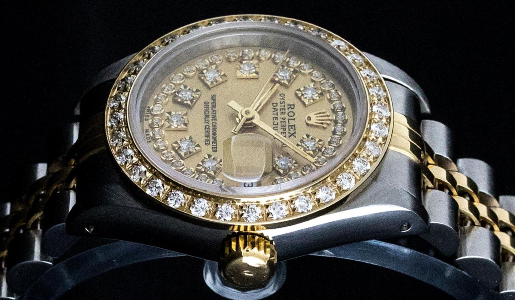 One Ladies 14K Two Tone Rolex Datejust Polished, Serviced & Electronically Tested, 14K Yellow Gold & Stainless Steel Case: 26mm, 14K Yellow Gold Crown, Custom Bezel: New 18K New Yellow Gold Beadset Diamond Bezel, Diamond Count: 32 Diamonds On Bezel, Total Bezel Weight .70 Carat, Clarity: SI-VS, Color: G to H. Custom Crystal: New Scratch Resistant Synthetic Sapphire Cyclops Lens. Custom Hands: New Luminescent Hands. Movement: Automatic Winding Movement Caliber 2030. Custom Dial: Champagne With String Single Cut Diamond Hour Markers, Diamond Count: 43 Diamonds On Dial, Clarity: SI-VS, Color: G to H. Date Window: 3 O'Clock Position Date Display, Model: Datejust. Condition: G-6 Extra Fine. Bracelet: Two Tone 14K Yellow Gold & Stainless Steel Jubilee Band. Bright Polish. 6.0 Inch Length, Adjustable. Standard Clasp, With Rolex Logo. This Watch Has Been Serviced Time Tested And Is In Excellent Condition It Is Free Of All Scratches And Dents.