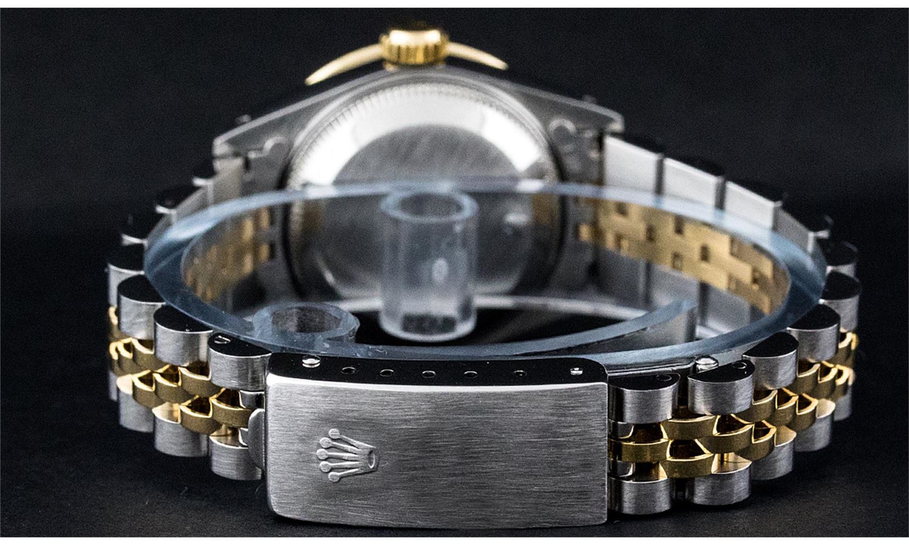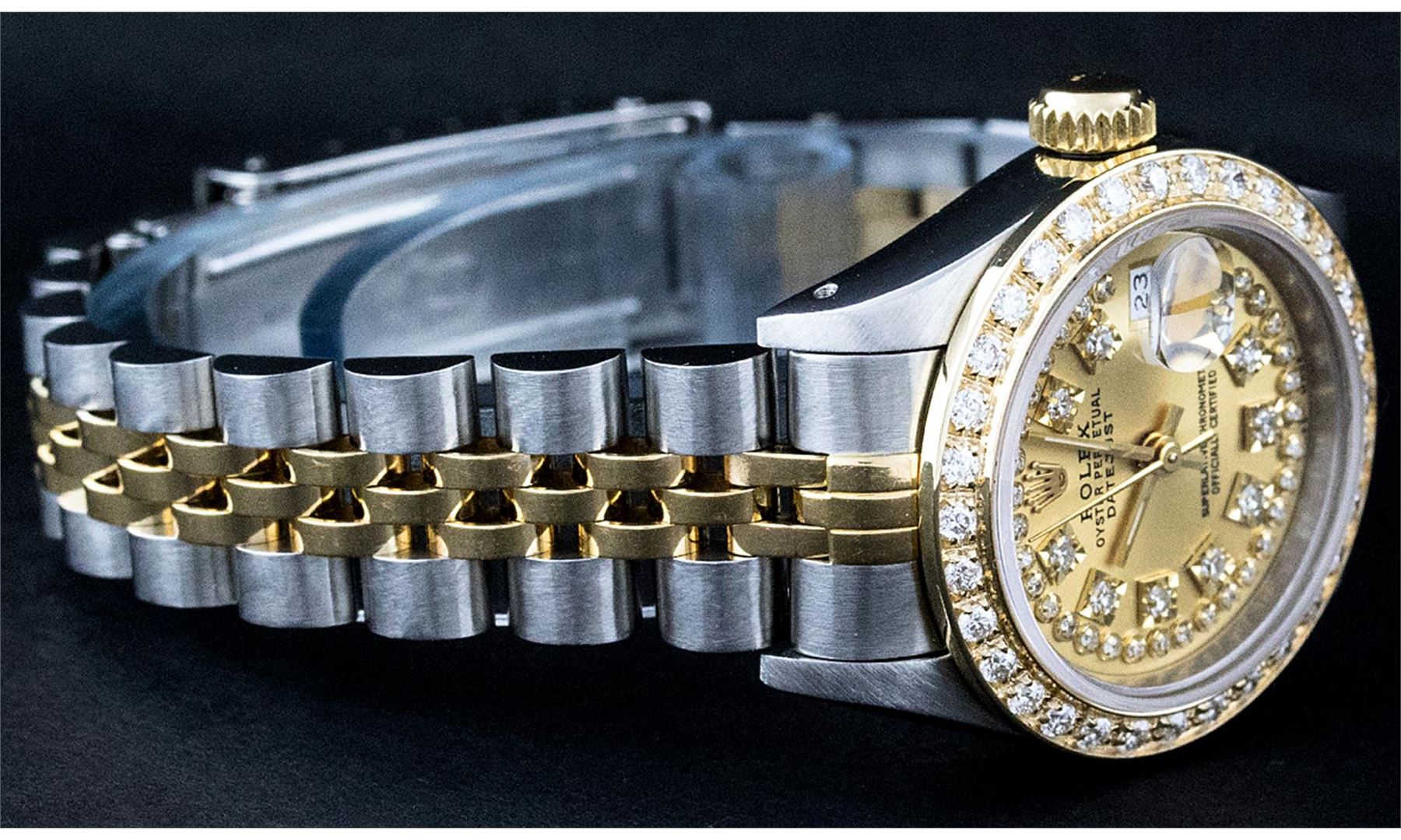 One Ladies 14K Two Tone Rolex Datejust Polished, Serviced & Electronically Tested, 14K Yellow Gold & Stainless Steel Case: 26mm, 14K Yellow Gold Crown, Custom Bezel: New 18K New Yellow Gold Beadset Diamond Bezel, Diamond Count: 32 Diamonds On Bezel, Total Bezel Weight .70 Carat, Clarity: SI-VS, Color: G to H. Custom Crystal: New Scratch Resistant Synthetic Sapphire Cyclops Lens. Custom Hands: New Luminescent Hands. Movement: Automatic Winding Movement Caliber 2030. Custom Dial: Champagne With String Single Cut Diamond Hour Markers, Diamond Count: 43 Diamonds On Dial, Clarity: SI-VS, Color: G to H. Date Window: 3 O'Clock Position Date Display, Model: Datejust. Condition: G-6 Extra Fine. Bracelet: Two Tone 14K Yellow Gold & Stainless Steel Jubilee Band. Bright Polish. 6.0 Inch Length, Adjustable. Standard Clasp, With Rolex Logo. This Watch Has Been Serviced Time Tested And Is In Excellent Condition It Is Free Of All Scratches And Dents.