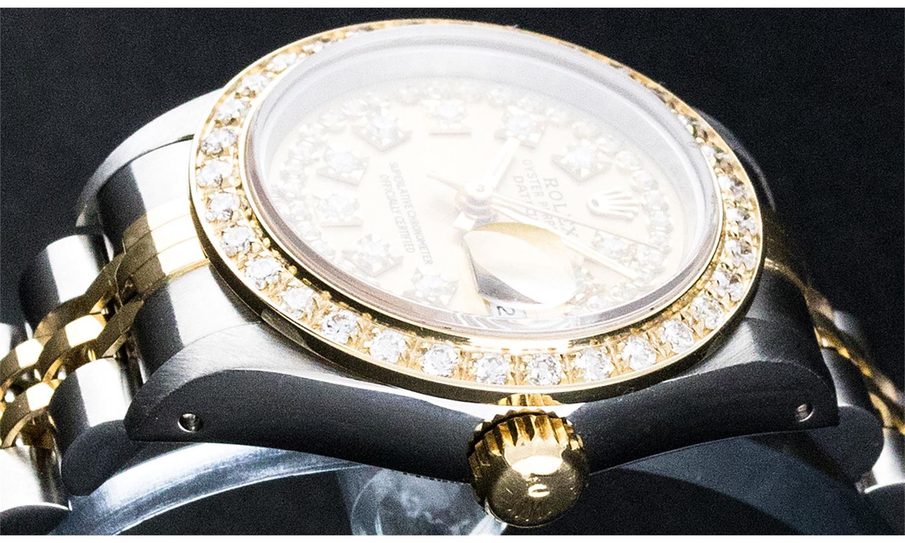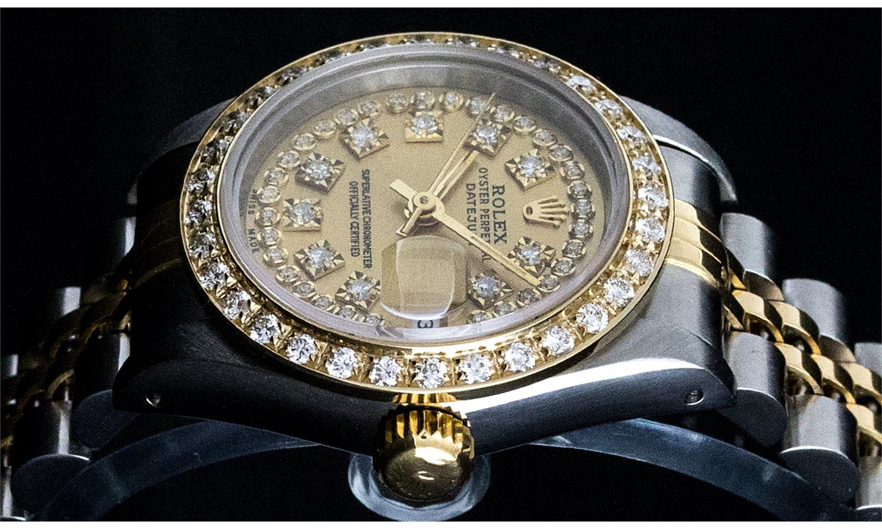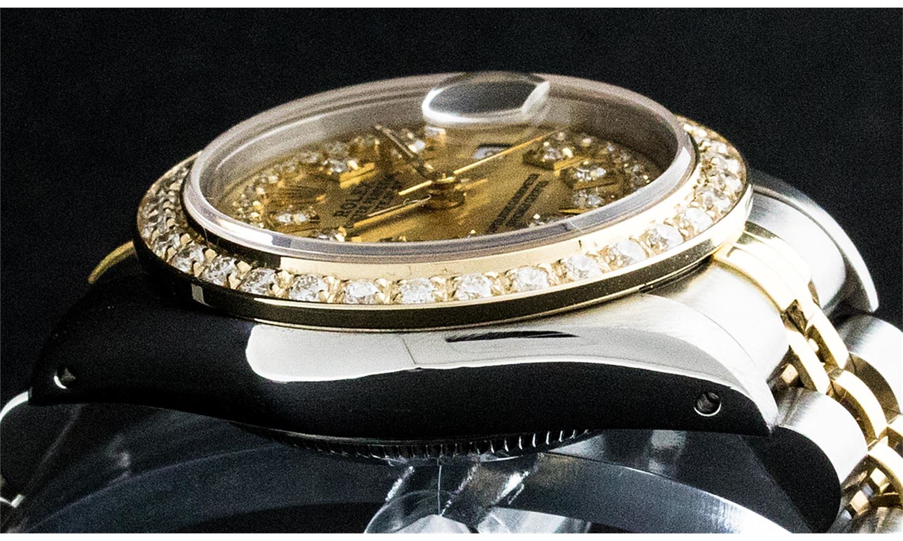 One Ladies 14K Two Tone Rolex Datejust Polished, Serviced & Electronically Tested, 14K Yellow Gold & Stainless Steel Case: 26mm, 14K Yellow Gold Crown, Custom Bezel: New 18K New Yellow Gold Beadset Diamond Bezel, Diamond Count: 32 Diamonds On Bezel, Total Bezel Weight .70 Carat, Clarity: SI-VS, Color: G to H. Custom Crystal: New Scratch Resistant Synthetic Sapphire Cyclops Lens. Custom Hands: New Luminescent Hands. Movement: Automatic Winding Movement Caliber 2030. Custom Dial: Champagne With String Single Cut Diamond Hour Markers, Diamond Count: 43 Diamonds On Dial, Clarity: SI-VS, Color: G to H. Date Window: 3 O'Clock Position Date Display, Model: Datejust. Condition: G-6 Extra Fine. Bracelet: Two Tone 14K Yellow Gold & Stainless Steel Jubilee Band. Bright Polish. 6.0 Inch Length, Adjustable. Standard Clasp, With Rolex Logo. This Watch Has Been Serviced Time Tested And Is In Excellent Condition It Is Free Of All Scratches And Dents.