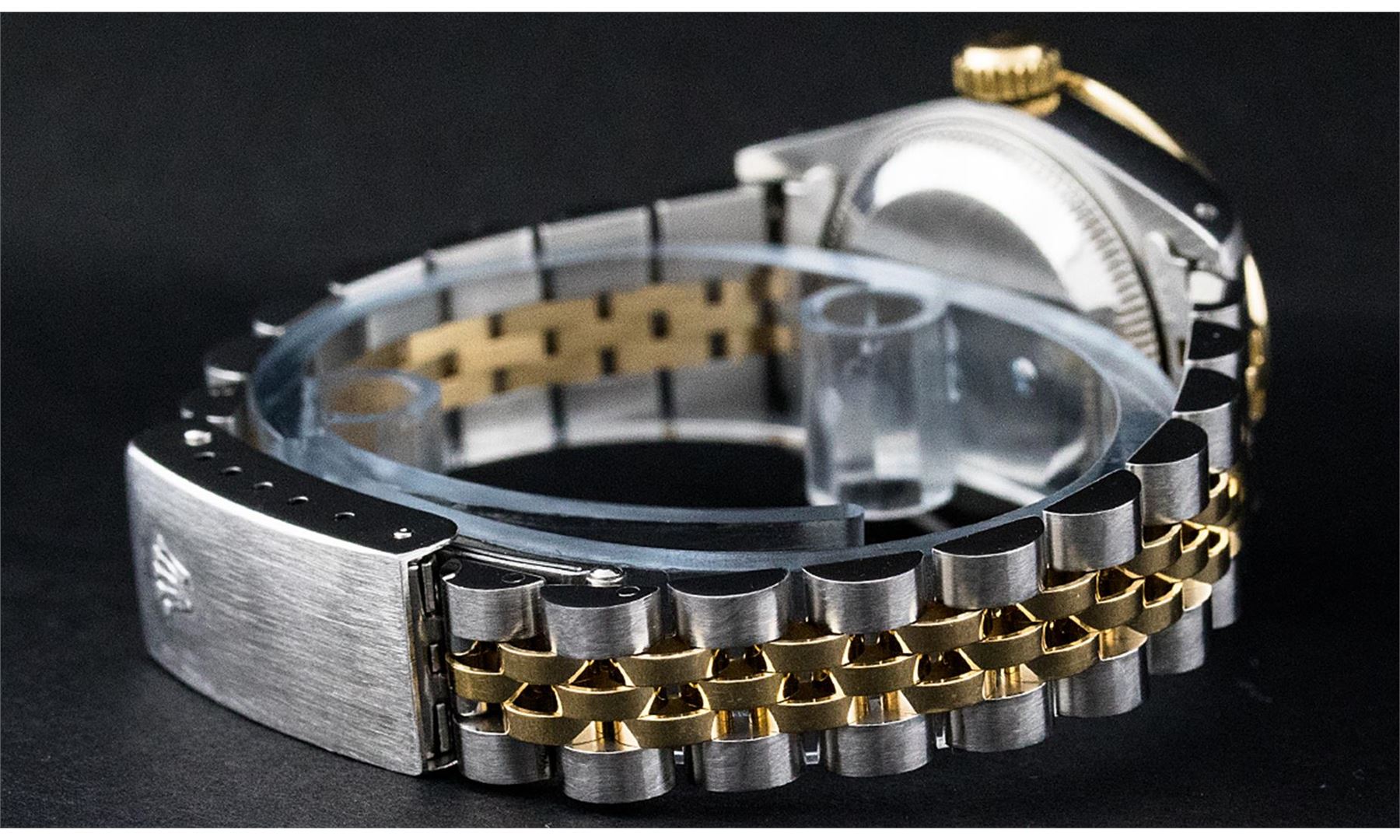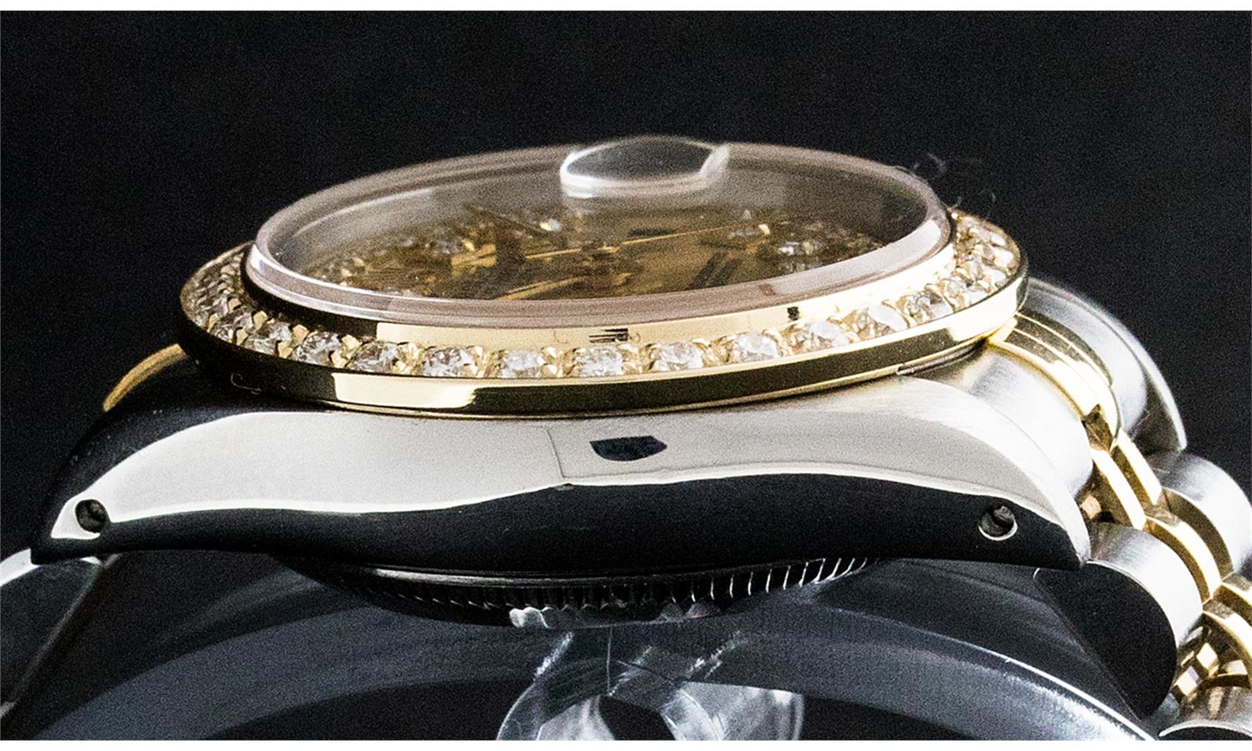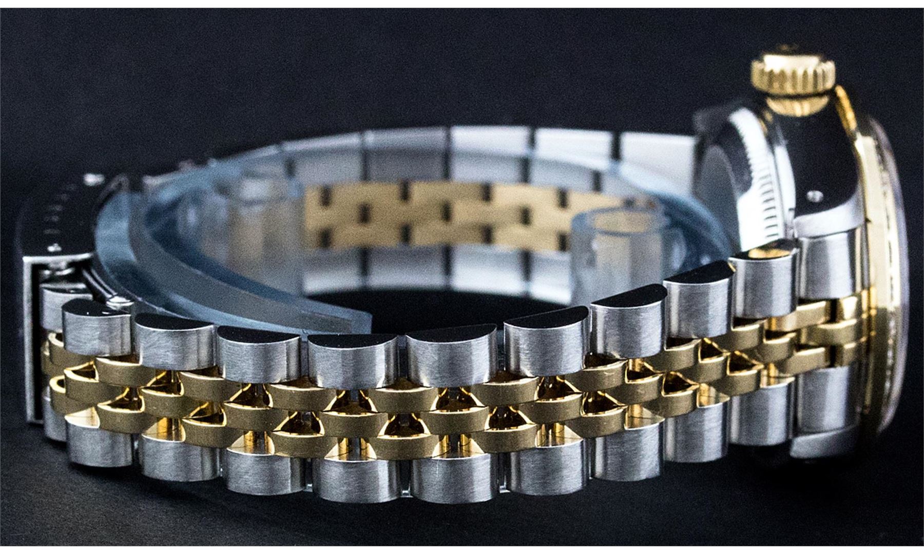 One Ladies 14K Two Tone Rolex Datejust Polished, Serviced & Electronically Tested, 14K Yellow Gold & Stainless Steel Case: 26mm, 14K Yellow Gold Crown, Custom Bezel: New 18K New Yellow Gold Beadset Diamond Bezel, Diamond Count: 32 Diamonds On Bezel, Total Bezel Weight .70 Carat, Clarity: SI-VS, Color: G to H. Custom Crystal: New Scratch Resistant Synthetic Sapphire Cyclops Lens. Custom Hands: New Luminescent Hands. Movement: Automatic Winding Movement Caliber 2030. Custom Dial: Champagne With String Single Cut Diamond Hour Markers, Diamond Count: 43 Diamonds On Dial, Clarity: SI-VS, Color: G to H. Date Window: 3 O'Clock Position Date Display, Model: Datejust. Condition: G-6 Extra Fine. Bracelet: Two Tone 14K Yellow Gold & Stainless Steel Jubilee Band. Bright Polish. 6.0 Inch Length, Adjustable. Standard Clasp, With Rolex Logo. This Watch Has Been Serviced Time Tested And Is In Excellent Condition It Is Free Of All Scratches And Dents.