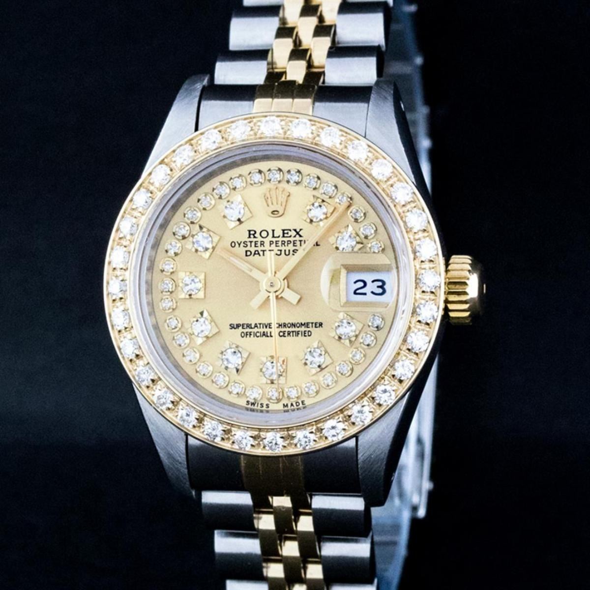One Ladies 14K Two Tone Rolex Datejust Polished, Serviced & Electronically Tested, 14K Yellow Gold & Stainless Steel Case: 26mm, 14K Yellow Gold Crown, Custom Bezel: New 18K New Yellow Gold Beadset Diamond Bezel, Diamond Count: 32 Diamonds On Bezel, Total Bezel Weight .70 Carat, Clarity: SI-VS, Color: G to H. Custom Crystal: New Scratch Resistant Synthetic Sapphire Cyclops Lens. Custom Hands: New Luminescent Hands. Movement: Automatic Winding Movement Caliber 2030. Custom Dial: Champagne With String Single Cut Diamond Hour Markers, Diamond Count: 43 Diamonds On Dial, Clarity: SI-VS, Color: G to H. Date Window: 3 O'Clock Position Date Display, Model: Datejust. Condition: G-6 Extra Fine. Bracelet: Two Tone 14K Yellow Gold & Stainless Steel Jubilee Band. Bright Polish. 6.0 Inch Length, Adjustable. Standard Clasp, With Rolex Logo. This Watch Has Been Serviced Time Tested And Is In Excellent Condition It Is Free Of All Scratches And Dents.