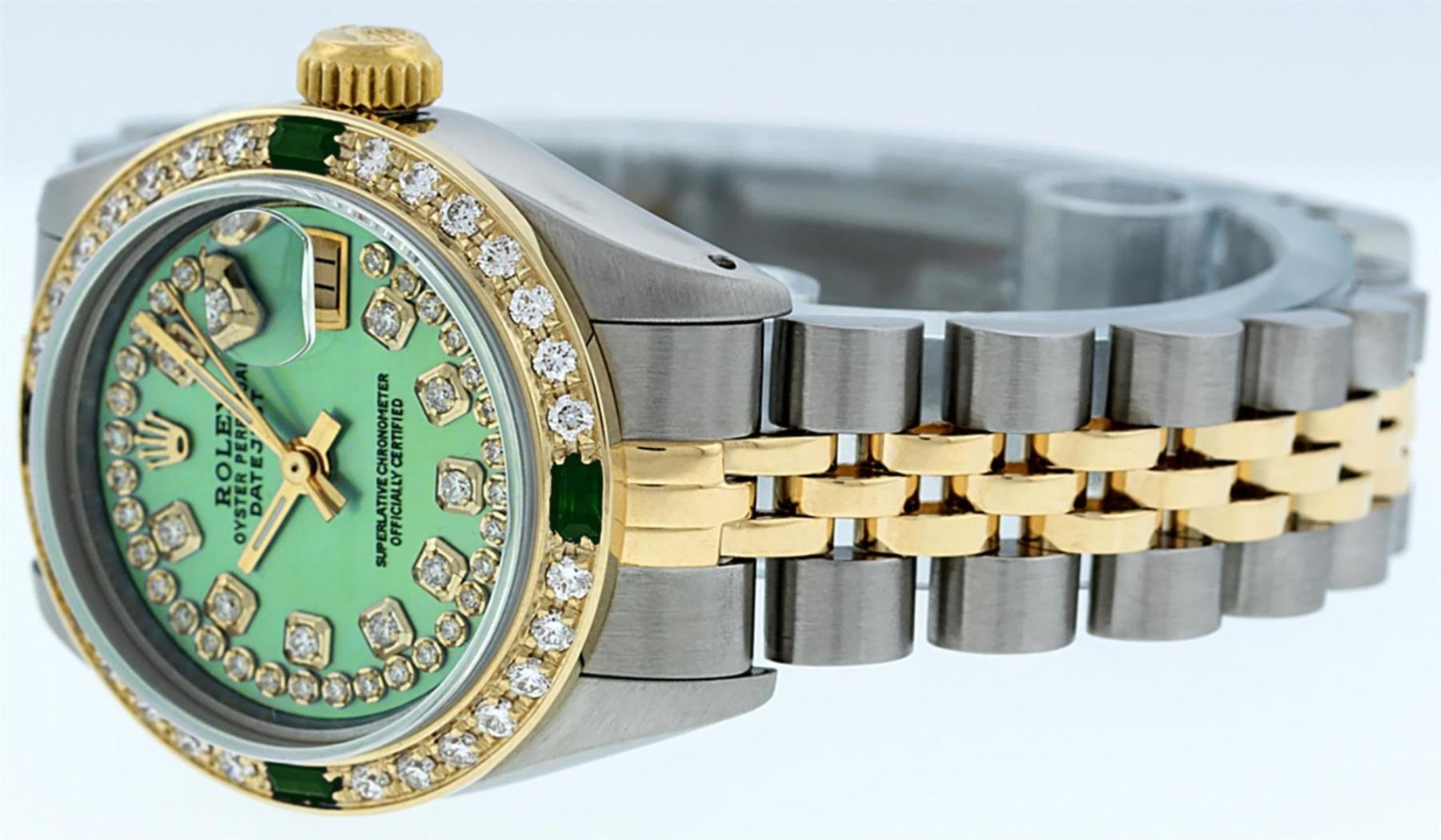 One Ladies Two Tone Yellow Gold And Stainless Steel Rolex Datejust Polished, Serviced & Electronically Tested, Yellow Gold & Stainless Steel Case: 26mm, Yellow Gold Crown, Custom Bezel: New 18K New Yellow Gold Beadset + Emerald Diamond Bezel, Stone Count: 28 Diamonds + 4 Emeralds In Bezel, Total Weight .70 Carat, Clarity: SI-VS, Color: G to H. Custom Crystal: New Scratch Resistant Synthetic Sapphire Cyclops Lens. Custom Hands: New Luminescent Hands. Movement: Automatic Winding Movement. Custom Dial: Green String With Diamond Hour Markers, Diamond Count: 43 Diamonds On Dial, Clarity: SI-VS, Color: VS2. Date Window: 3 O'Clock Position Date Display, Model: Datejust. Condition: G-6 Extra Fine. Bracelet: Two Tone Yellow Gold & Stainless Steel Jubilee Band. Bright Polish. 6.0 Inch Length, Adjustable. Standard Clasp, With Rolex Logo. This Watch Has Been Serviced Time Tested And Is In Excellent Condition It Is Free Of All Scratches And Dents.