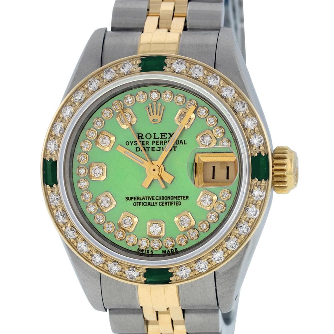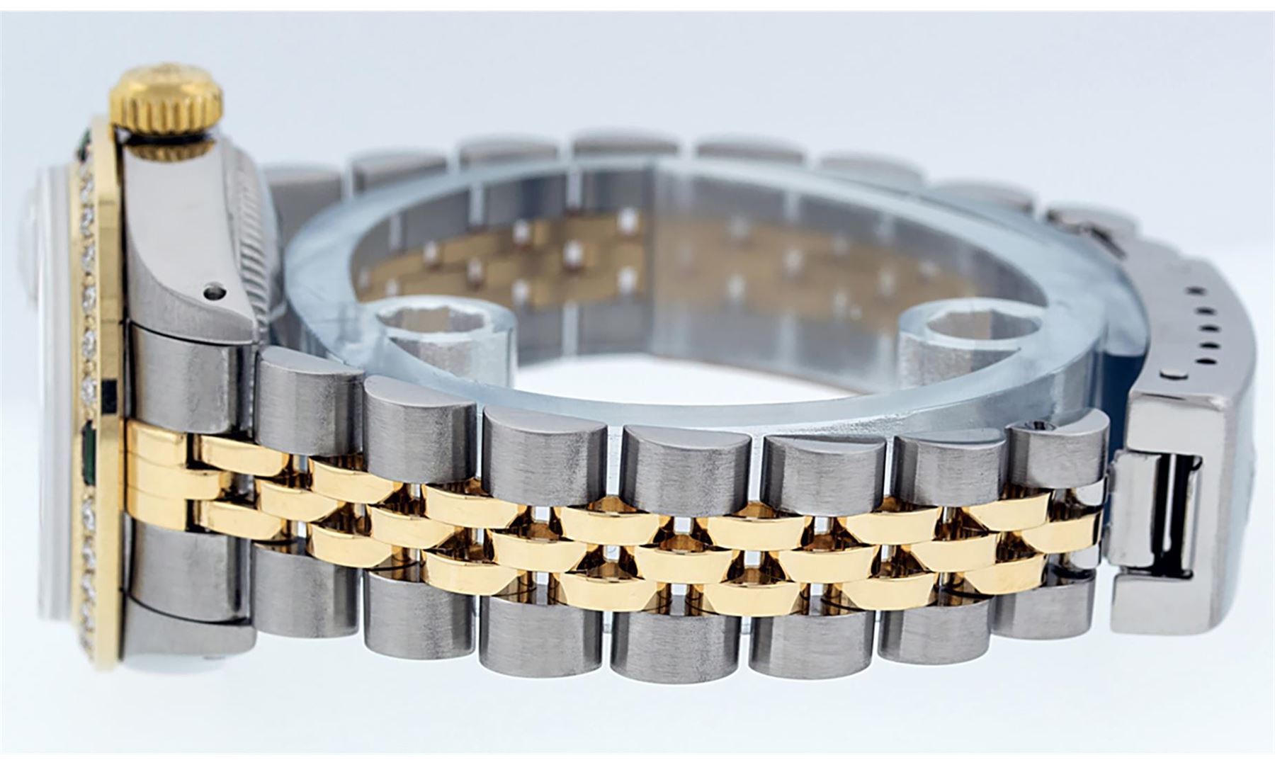 One Ladies Two Tone Yellow Gold And Stainless Steel Rolex Datejust Polished, Serviced & Electronically Tested, Yellow Gold & Stainless Steel Case: 26mm, Yellow Gold Crown, Custom Bezel: New 18K New Yellow Gold Beadset + Emerald Diamond Bezel, Stone Count: 28 Diamonds + 4 Emeralds In Bezel, Total Weight .70 Carat, Clarity: SI-VS, Color: G to H. Custom Crystal: New Scratch Resistant Synthetic Sapphire Cyclops Lens. Custom Hands: New Luminescent Hands. Movement: Automatic Winding Movement. Custom Dial: Green String With Diamond Hour Markers, Diamond Count: 43 Diamonds On Dial, Clarity: SI-VS, Color: VS2. Date Window: 3 O'Clock Position Date Display, Model: Datejust. Condition: G-6 Extra Fine. Bracelet: Two Tone Yellow Gold & Stainless Steel Jubilee Band. Bright Polish. 6.0 Inch Length, Adjustable. Standard Clasp, With Rolex Logo. This Watch Has Been Serviced Time Tested And Is In Excellent Condition It Is Free Of All Scratches And Dents.