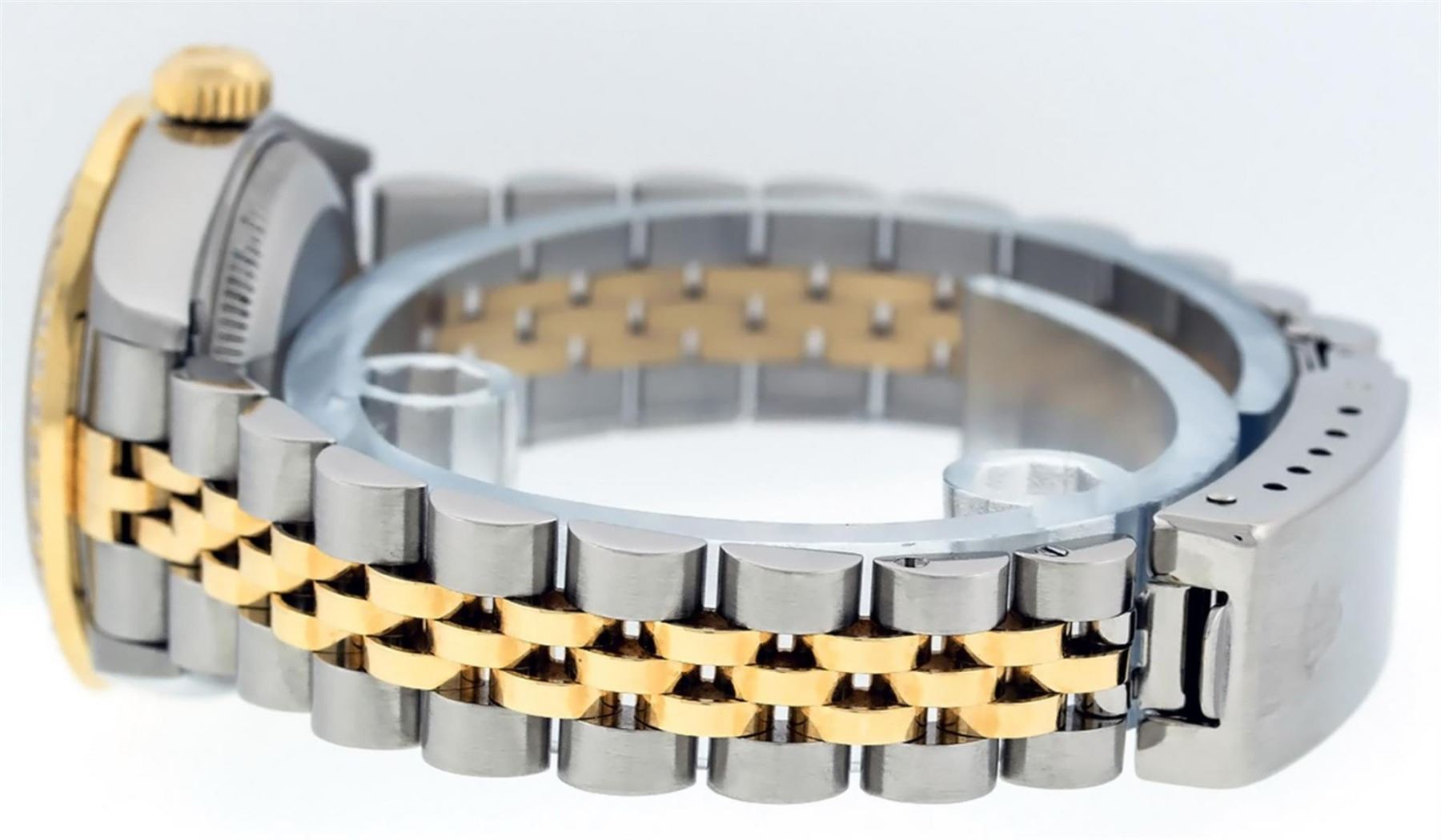 One Ladies Quickset 18K Two Tone Rolex Datejust Polished, Serviced & Electronically Tested, 18K Yellow Gold & Stainless Steel Case: 26mm, 18K Yellow Gold Crown, Diamond Lugs: 24 Diamonds On Lugs, Clarity: SI-VS, Color: G to H, Clarity SI-VS. Custom Bezel: New 18K Yellow Gold Pyramid Diamond Bezel, Diamond Count: 24 Diamonds On Bezel, Total Weight .50 Carat, Clarity: SI-VS, Color: G to H. Custom Crystal: New Scratch Resistant Synthetic Sapphire Cyclops Lens. Custom Hands: New Luminescent Hands. Movement: Automatic Winding Movement Caliber 2235. Custom Dial: Refinished Mother Of Pearl Sapphire String, Stone Count: 33 Diamonds + 10 Sapphires On Dial, Clarity: SI-VS, Color: G to H. Date Window: 3 O'Clock Position Date Display, Model: Quickset Datejust. Condition: G-6 Extra Fine. Bracelet: Two Tone 18K Yellow Gold & Stainless Steel Jubilee Band. Bright Polish. 6.0 Inch Length, Adjustable. Standard Clasp, With Rolex Logo. This Watch Has Been Serviced Time Tested And Is In Excellent Condition It Is Free Of All Scratches And Dents. This Watch Comes With A Rolex Box.
