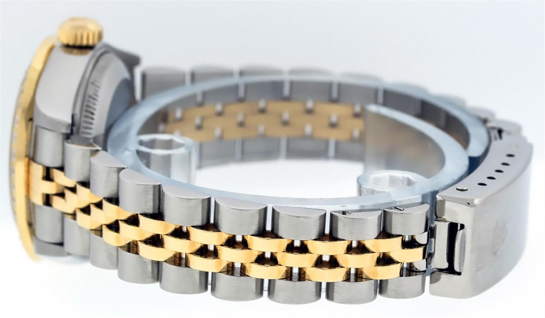 One Ladies Quickset 18K Two Tone Rolex Datejust Polished, Serviced & Electronically Tested, 18K Yellow Gold & Stainless Steel Case: 26mm, 18K Yellow Gold Crown, Diamond Lugs: 24 Diamonds On Lugs, Clarity: SI-VS, Color: G to H, Clarity SI-VS. Custom Bezel: New 18K Yellow Gold Pyramid Diamond Bezel, Diamond Count: 24 Diamonds On Bezel, Total Weight .50 Carat, Clarity: SI-VS, Color: G to H. Custom Crystal: New Scratch Resistant Synthetic Sapphire Cyclops Lens. Custom Hands: New Luminescent Hands. Movement: Automatic Winding Movement . Custom Dial: Refinished Mother Of Pearl Sapphire String, Stone Count: 33 Diamonds + 10 Sapphires On Dial, Clarity: SI-VS, Color: G to H. Date Window: 3 O'Clock Position Date Display, Model: Quickset Datejust. Condition: G-6 Extra Fine. Bracelet: Two Tone 18K Yellow Gold & Stainless Steel Jubilee Band. Bright Polish. 6.0 Inch Length, Adjustable. Standard Clasp, With Rolex Logo. This Watch Has Been Serviced Time Tested And Is In Excellent Condition It Is Free Of All Scratches And Dents.